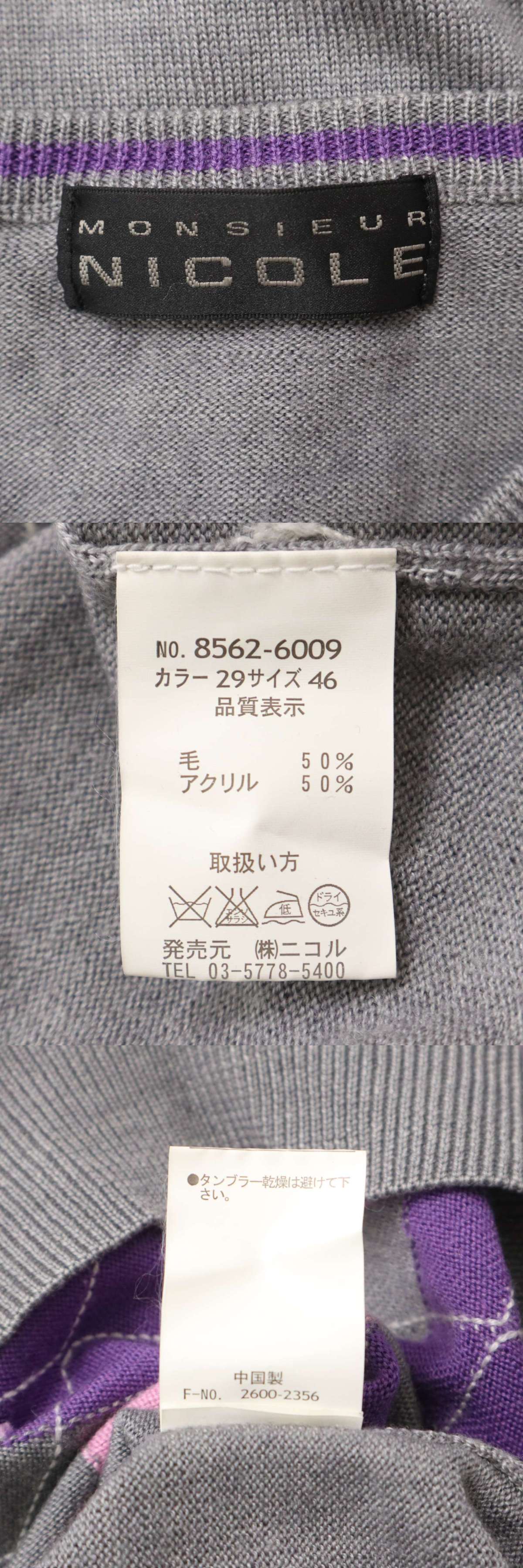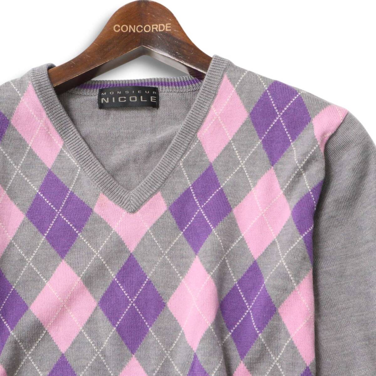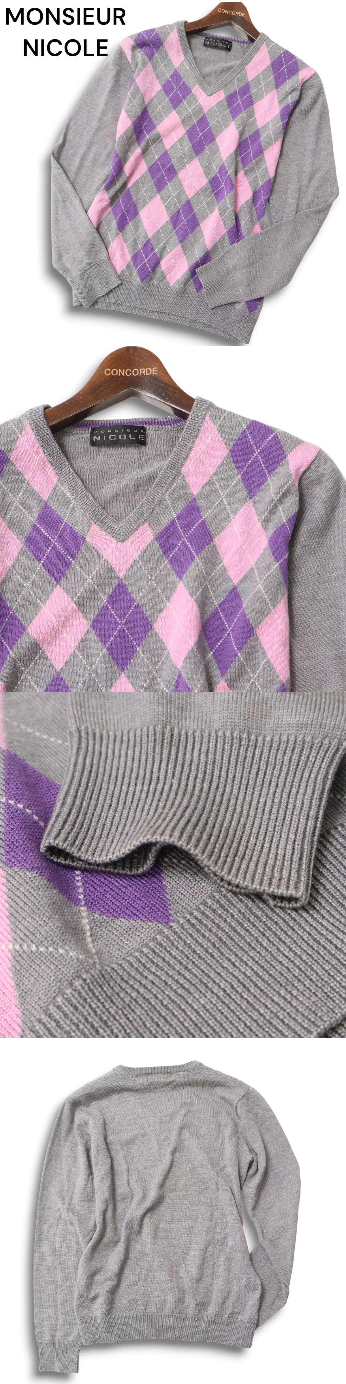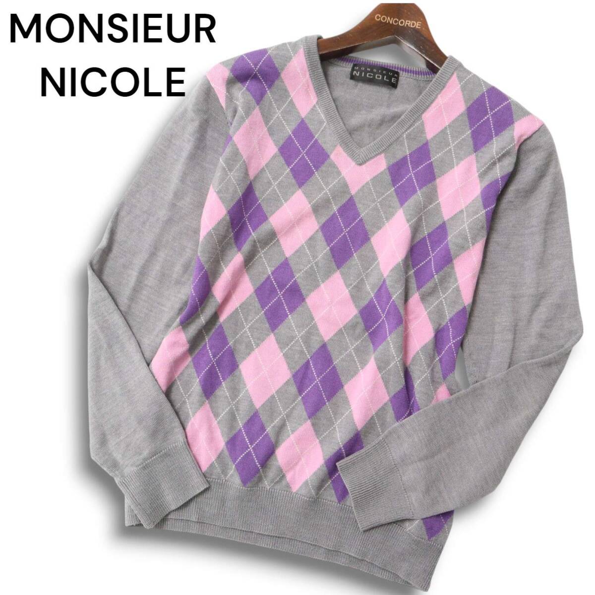 MONSIEUR NICOLE ムッシュ ニコル 秋冬 ウール★ アーガイル柄 Vネック ニット セーター Sz.46 メンズ 灰 グレー