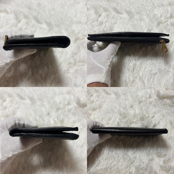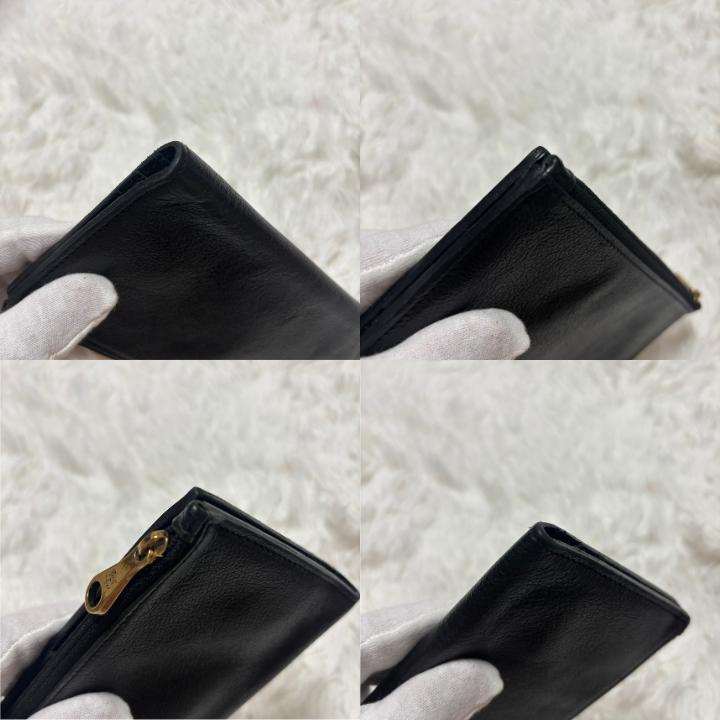 高品質なレザー製のブラック二つ折り財布、ジッパー付きポケット付きで機能的。