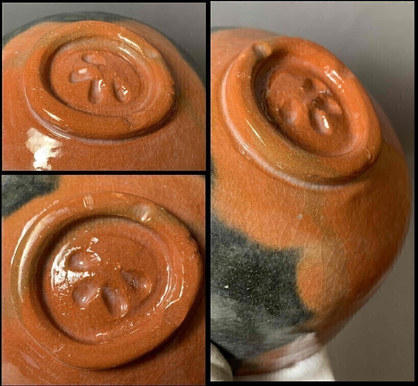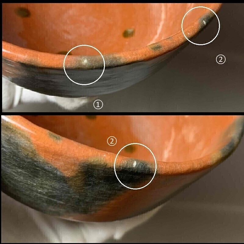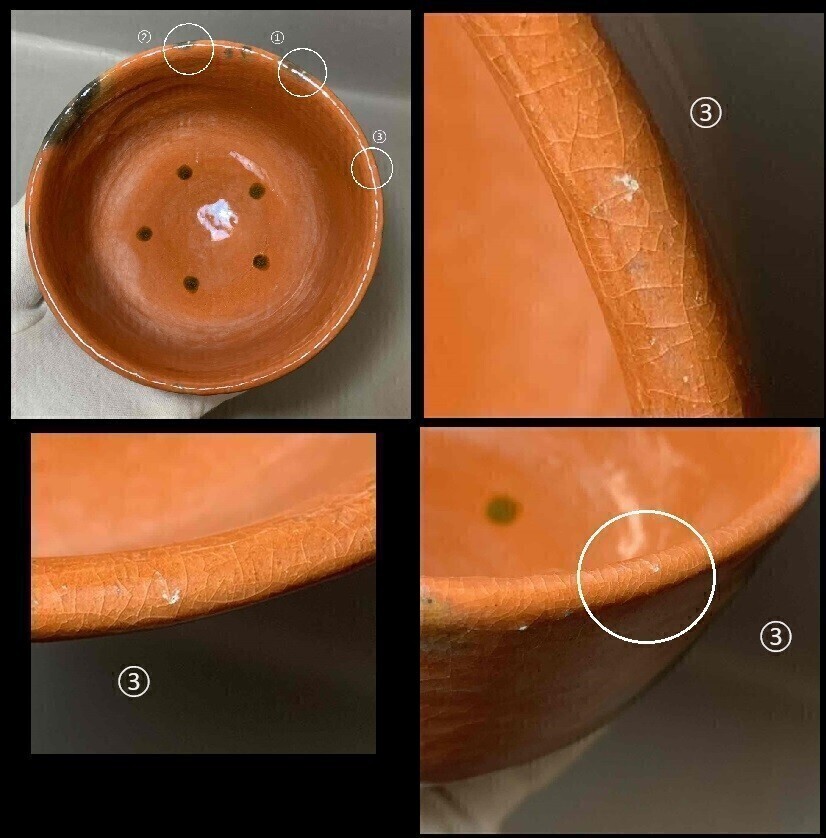 口辺③に傷あります。①②口辺に白い釉のところ、ガラス質の釉がかかっています。箱は 汚れ、シミ、痛みあります。本体に作家印はありません。印や写真以外にも傷、汚れあります。
