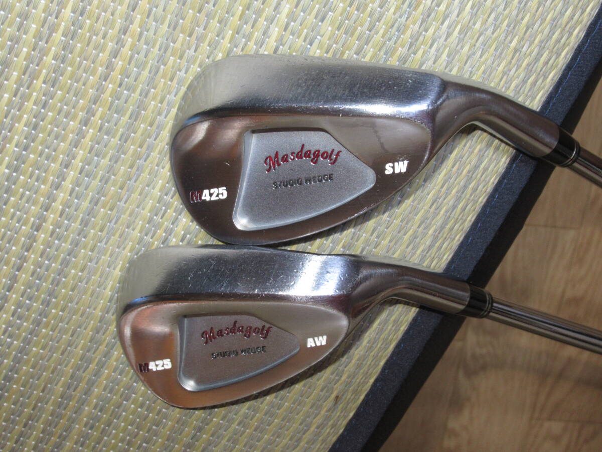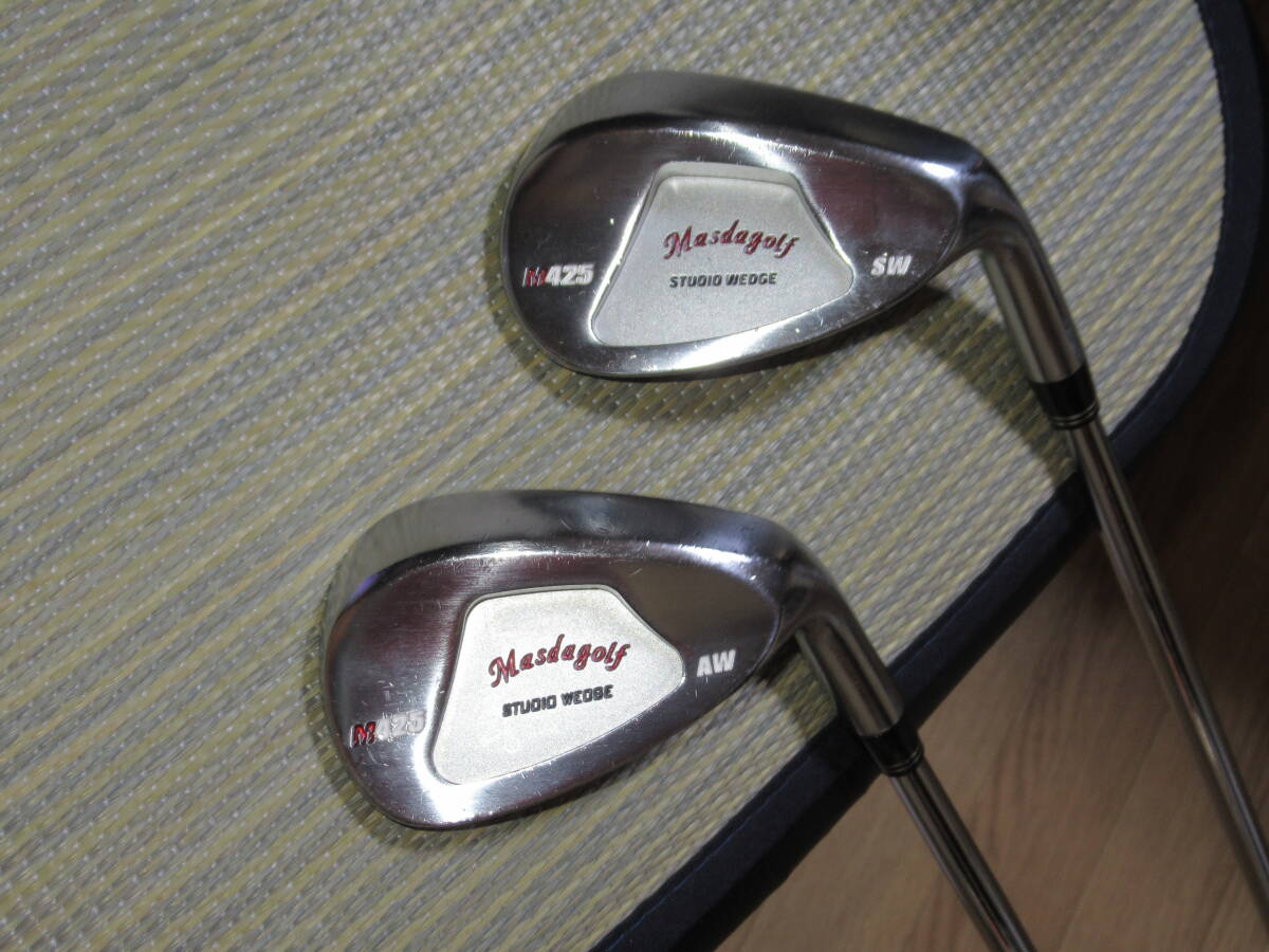 マスダゴルフの名器ウェッジ『M425』のAWとSWの2本セットです。シャフトは日本シャフトの「モーダス3 TOUR125」のフレックスRです。グリップはイオミックの「Xエボリューション ブラックアーマー2.3」で、イエローがAWでレッドがSWです。ロフト角はAWが52度、SWが58度です。ジャンボ尾崎プロが使用していたグースネックウェッジです。長さはどちらも35インチ、重さとバランスはAWが463g・D1、SWが467g・D2.5です。シャフトはあえてRフレックスとしました。現在吊るしで販売されているウェッジはストレートネックがほとんどなので異形に見えるかもしれませんが、タイガーが出現する以前の日本のクラブメーカーのウェッジ形状です。配送料はご負担下さい。配送はお得なおてがる配送(ヤマト運輸)を予定しております。東京都からサイズ140/2kg以下で発送します。配送料はおてがる配送のサイトを御参照下さい。お支払い手続き後の翌日には発送する予定です。値引き交渉および入札後の取り消しには対応致しません。ノークレーム・ノーリターンにてお願い致します。