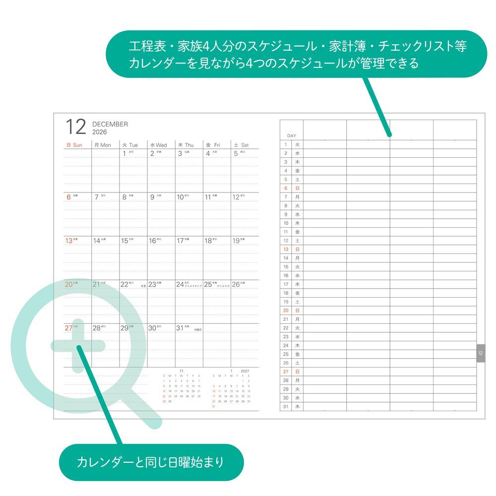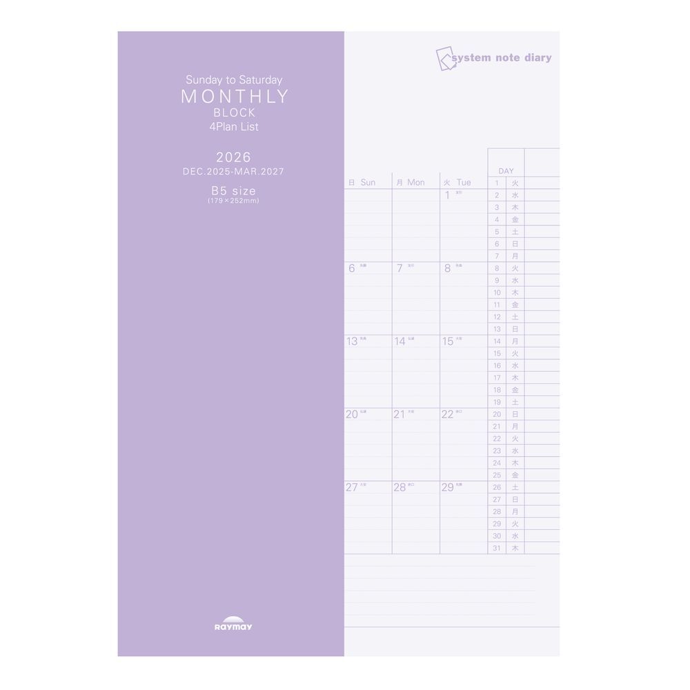 ブロック式マンスリー(片面1ヶ月)、4プランリスト式マンスリー(片面1ヶ月)+ノート4ページ