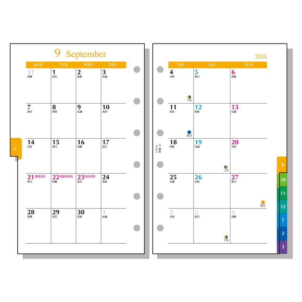 見開き両面1ヶ月ブロック式・インデックス付・ 月の満ち欠け表示入り。
