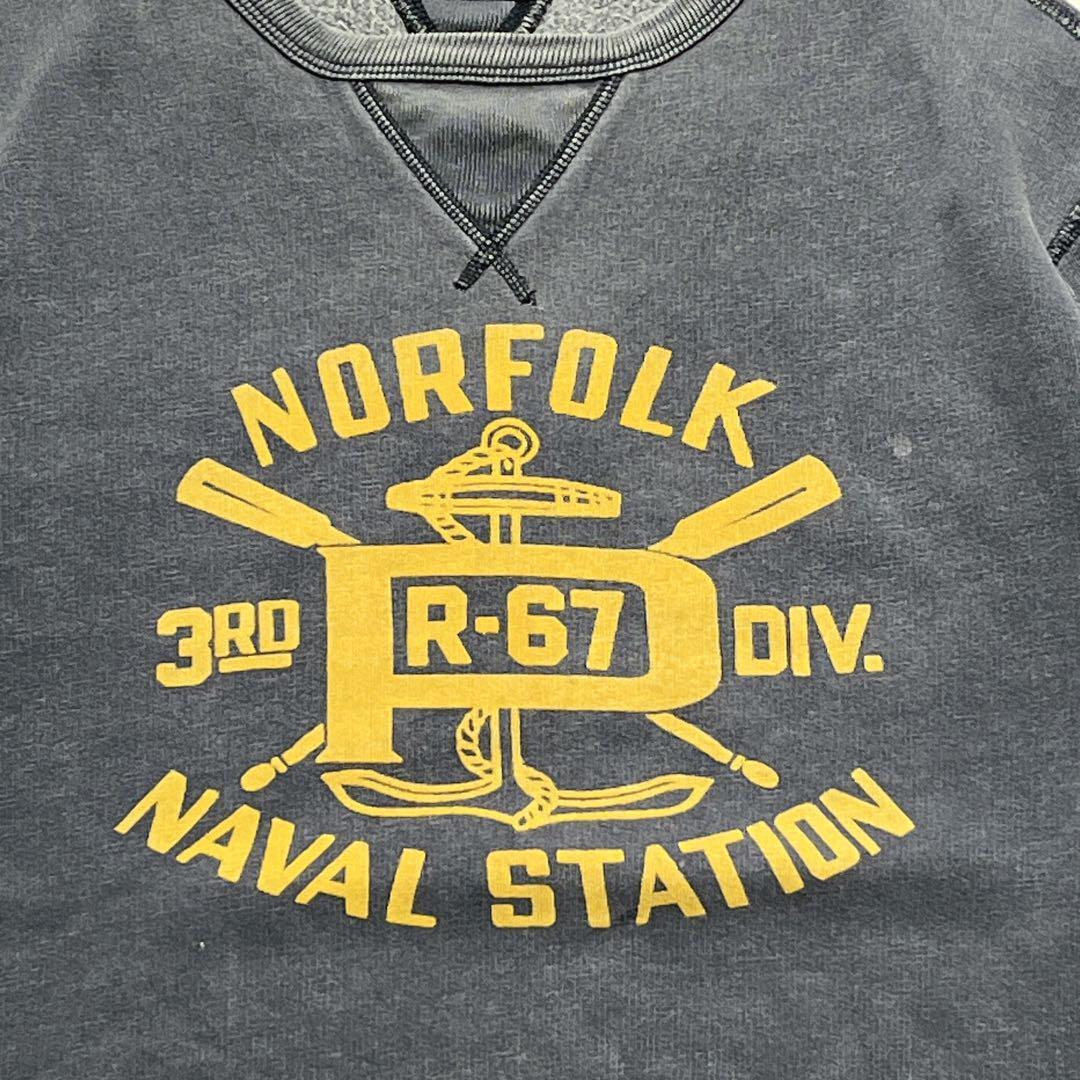フロントには、ミリタリーライクな【NORFOLK NAVAL STATION】のデザインが施されており、【ひび割れた染み込みプリント】**がさらに古着らしさを引き立てています。