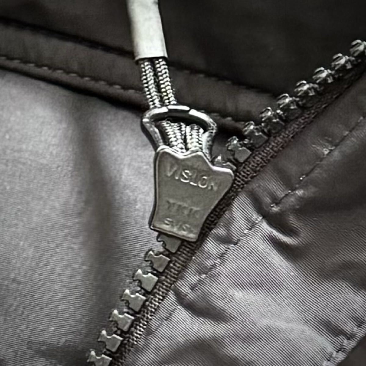 刺繍ロゴ、ファスナー含めオールブラックのシンプルなデザインジャケット。