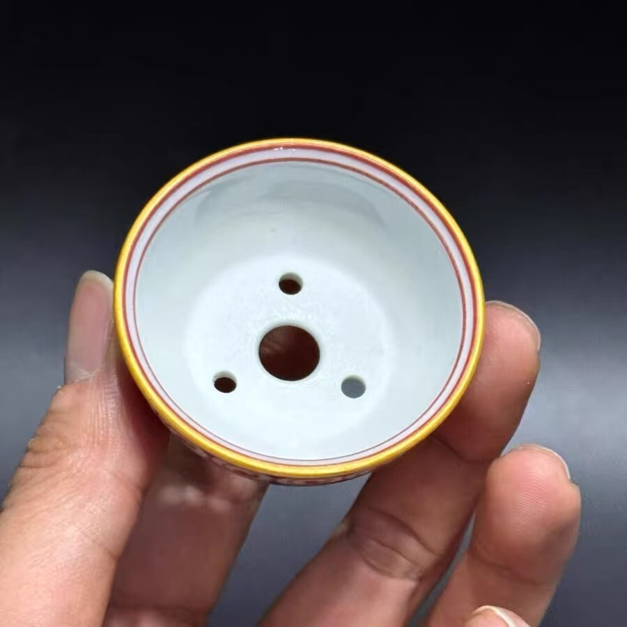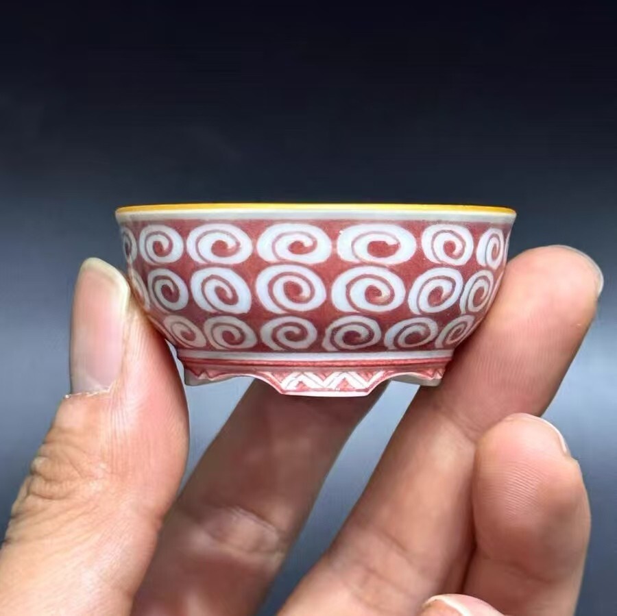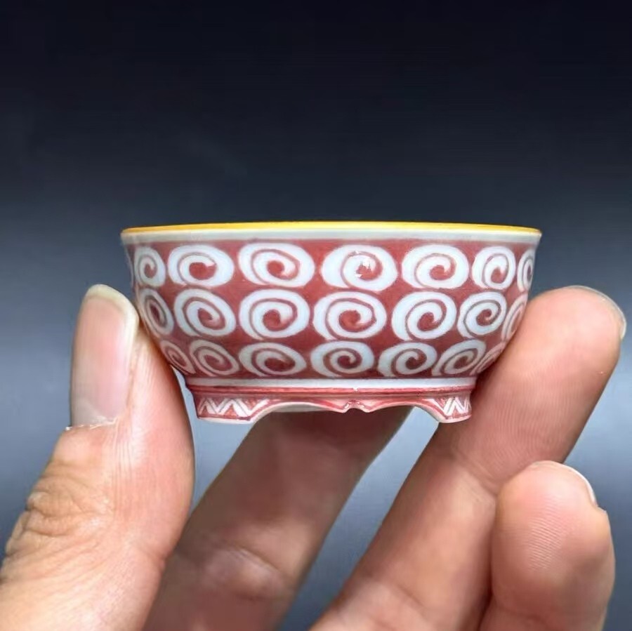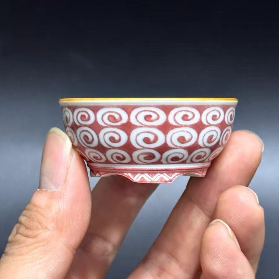 陶芸作家・藤原窯月が一筆一筆丁寧に純手描きした「赤絵 巻雲文様」ミニ雅鉢。瑞々しい赤色の釉薬を基調に、伝統的な巻雲文様が緻密に連なっており、上部の温かい黄色い縁取りと足部の装飾文様と相まって、まるで「古代の神器から漂うような、荘厳で神秘的な雰囲気」を演出します。