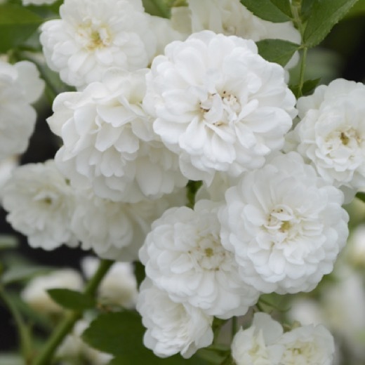 小輪八重咲きの花が穂状に枝先に咲き乱れて、花名の「彗星」のよう。コンパクトな樹形で繰り返しよく咲きます。