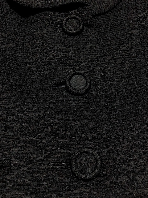 立体感のあるツイード調の生地が使用されており、高級感が漂います。ジャケットは丸みを帯びた襟とくるみボタンが女性らしく優しい印象。スカートは上品なタイトシルエットで、スタイルを美しく見せてくれます。