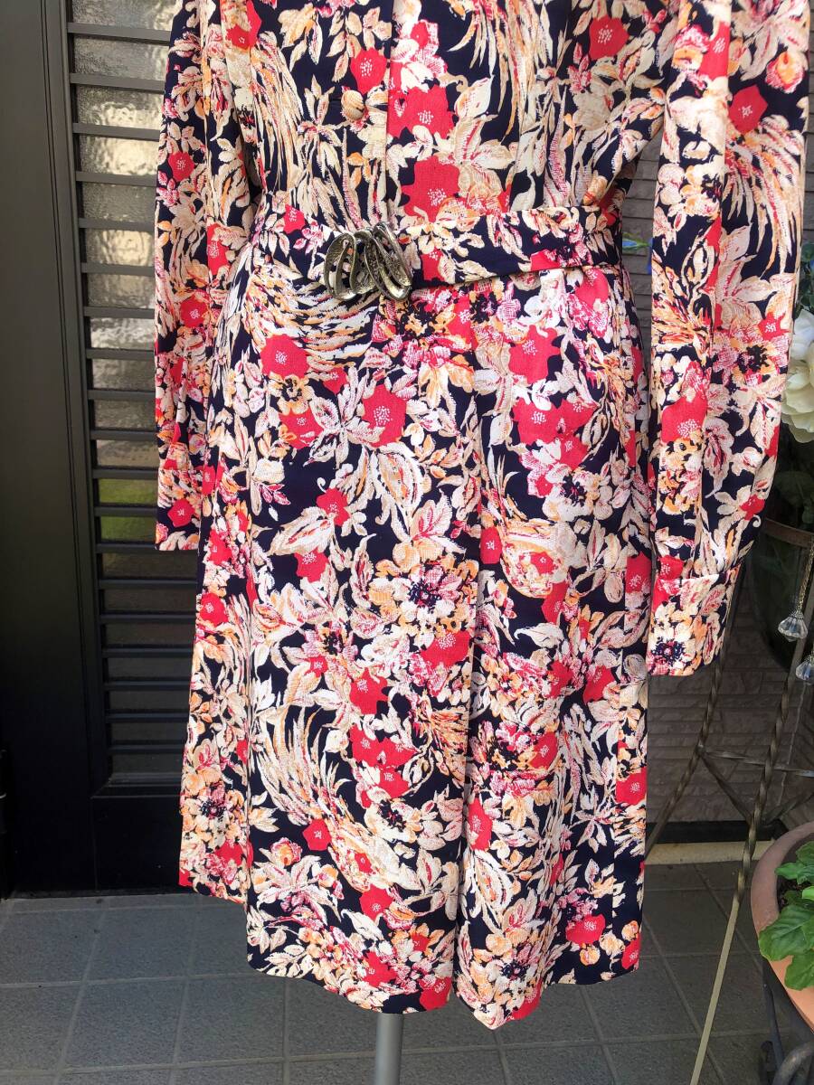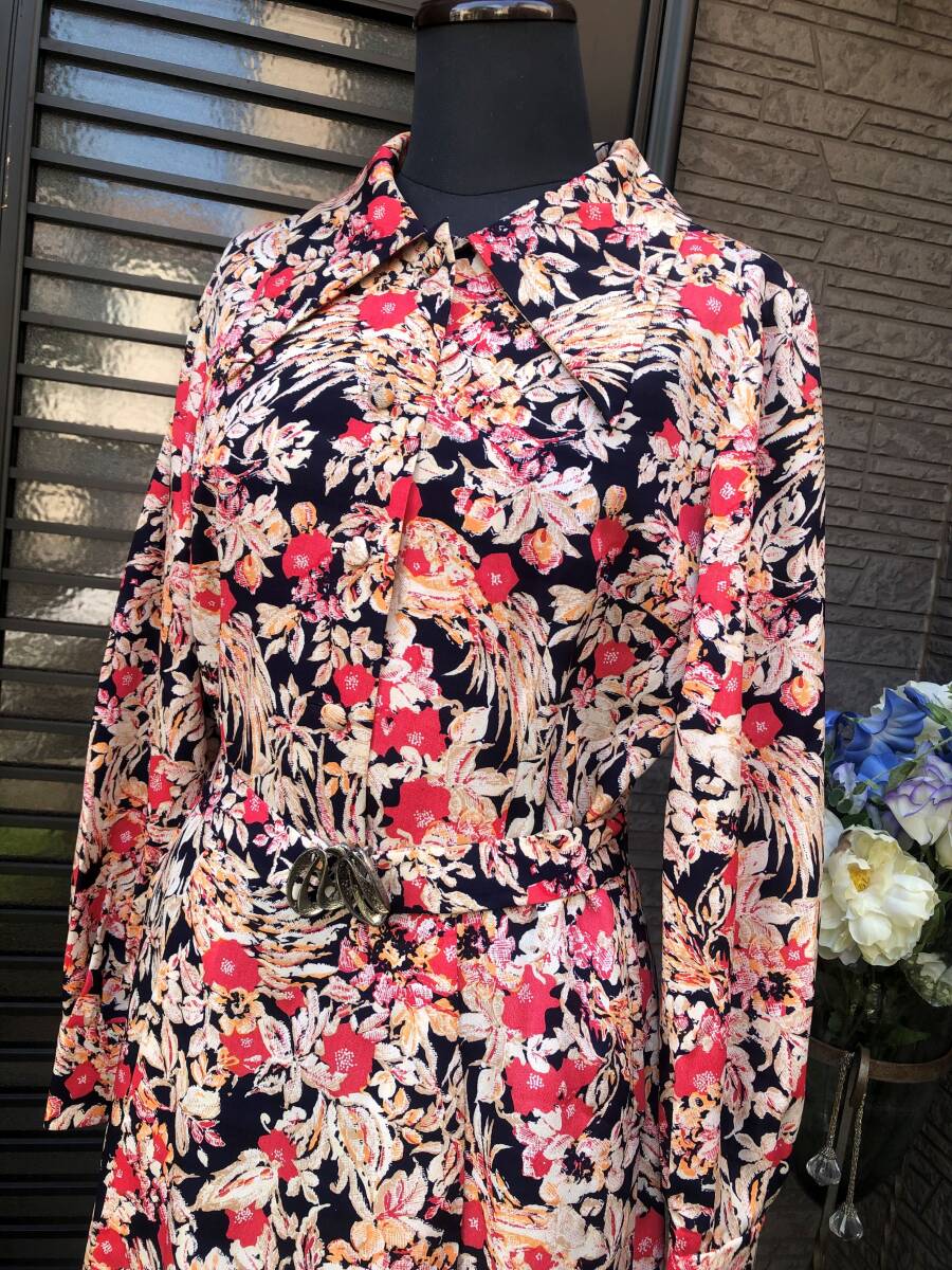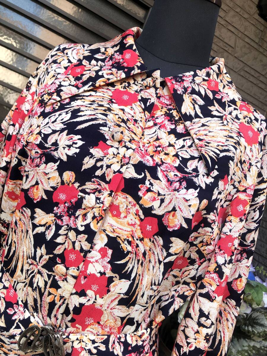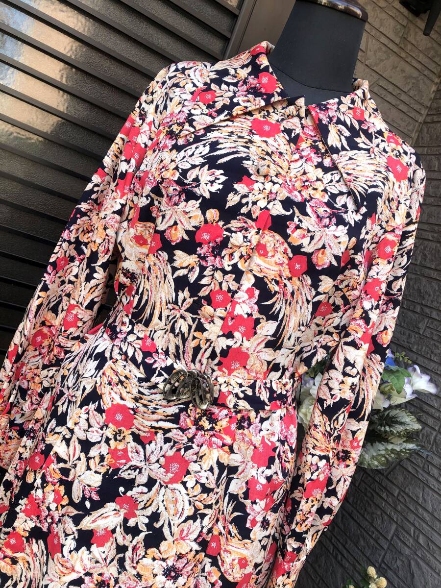 昭和レトロ ハンドメイド ワンピース M~L 送料230円 黒地×お花柄