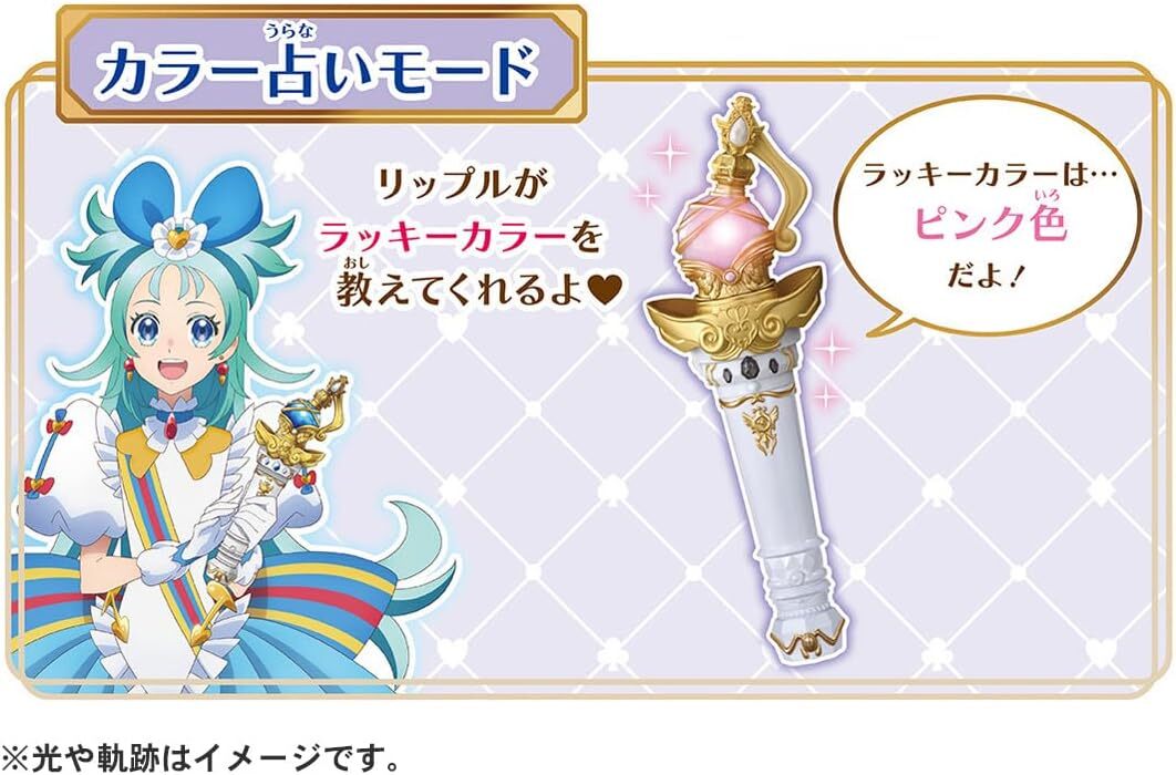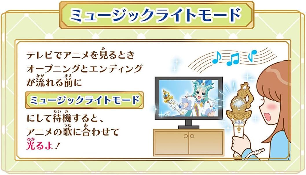 ■オープニング、エンディング、キャラソンとセリフが楽しめるミュージックモード、アニメの曲と連動して光り方が変わるミュージックライトモード、好きな色を選んでプリンセスを応援するペンライトモード、そして、色で占い遊びができるカラー占いモードがあります。