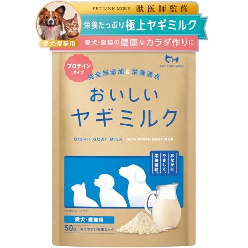 「PETLINKMORE ヤギミルク オーガニック 犬用 猫用 ドッグミルク 水分補給 幼犬 シニア犬 たんぱく質 栄養補給 オランダ産 パウダー」▼4571683360140▼(商品説明)-/プロテイン50g/-・Size:プロテイン50g・?愛犬・愛猫の栄養補給に栄養が不足しがちなペットの栄養補給にPETLINKMOREのヤギミルク誕生。加齢・疾患などで痩せ気味・栄養不足なペットの栄養補給に役立ちます・?完全無添加・おなかにやさしい添加物を一切使用していない100%無添加です。また、お腹が緩くなる原因といわれる乳糖の含有量が牛乳よりも少なく、牛乳アレルギーの主な原因のたんぱく質の一種「αS1カイゼン」が、ほとんど検出されず、アレルギーを起こしにくいのも特徴です・?獣医師監修獣医師監修。プロ監修の元製造された安心の製品です・?保存方法使用後は高温多湿・直射日光を避け、密封して冷暗所で保存して下さい。どうしても湿気の多い場所での保管となる場合は冷蔵庫での保管をお願いします