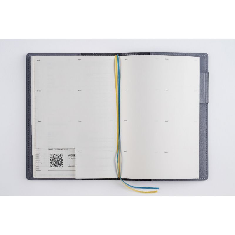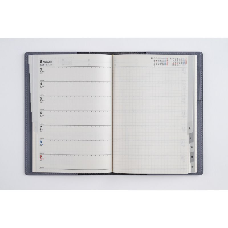 【週間予定表】左ページは1週間分のスケジュール欄、右ページは方眼メモ。メモスペースは表を作成したり図やイラストを描いたりと、フレキシブルにご活用いただけます。