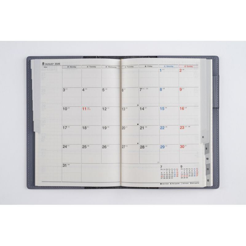 【月間予定表】カレンダーと同じ感覚で見ることができ、週ごとの予定が把握しやすいブロック式。平日の仕事の予定や、週末土日の予定をまとめて書きやすい月曜始まり。左端にはメモスペース、右下には前次月のカレンダーが付いています。