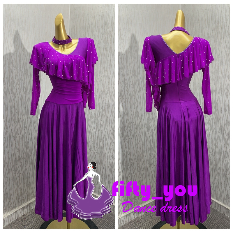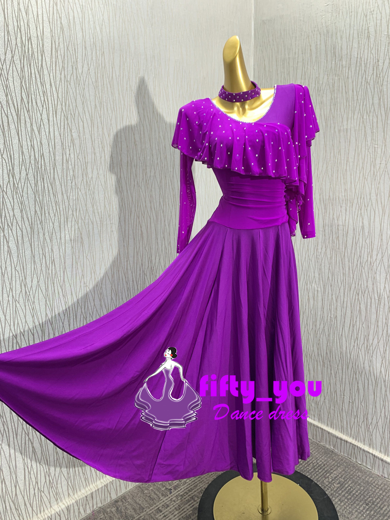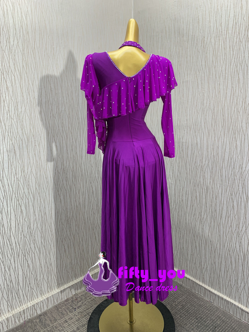 新品fifty_you レディース社交ダンス衣装 練習試合用ストレッチ付き素材ダンスワンピース ライトストーン飾り サイズセミオーダー 紫