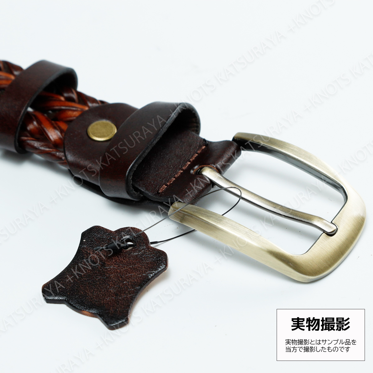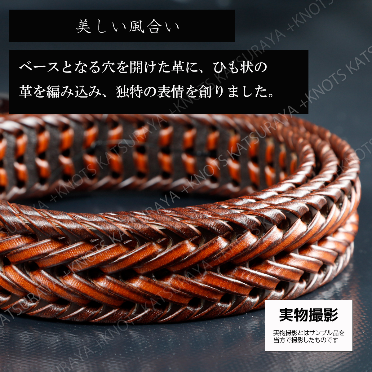 しっかりと存在感ある編み込みベルト、先端に至るまで美しい装飾が魅力、機械では難しい編み込みの行程を手作業で行った高品質タイプです。リアルレザーならでは上品な手触りとツヤ感をお楽しみください。デニムやジーンズ、チノパンなどのカジュアル装いに相性がとてもよいです。また、スーツ、スラックスと合わせると大人の魅力をぐっと引き立ててくれます。本革ですがメッシュタイプなので通気性が良く、どの位置にもバックルピンが刺せて穴あけ不要、食後の調整なども1㎝刻みで行えるなど使い勝手も良好です。長すぎる場合はバックル部のネジを外しハサミで切断することで調整可能です。
