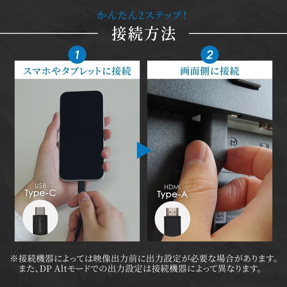 本製品はスマートフォンやモニター向けのUSB Type-C to HDMI Type-Aケーブルです。DP Alt(DisplayPort Alternate)モードに対応した機器のコンテンツをモニターなどの大画面でお楽しみいただけます。