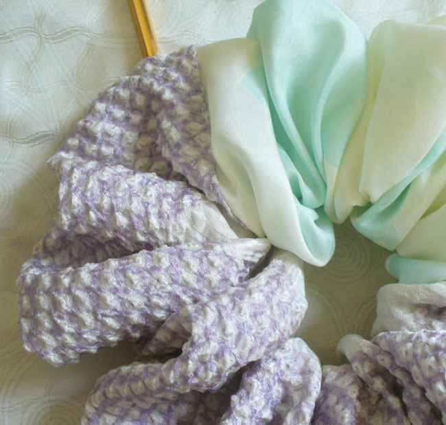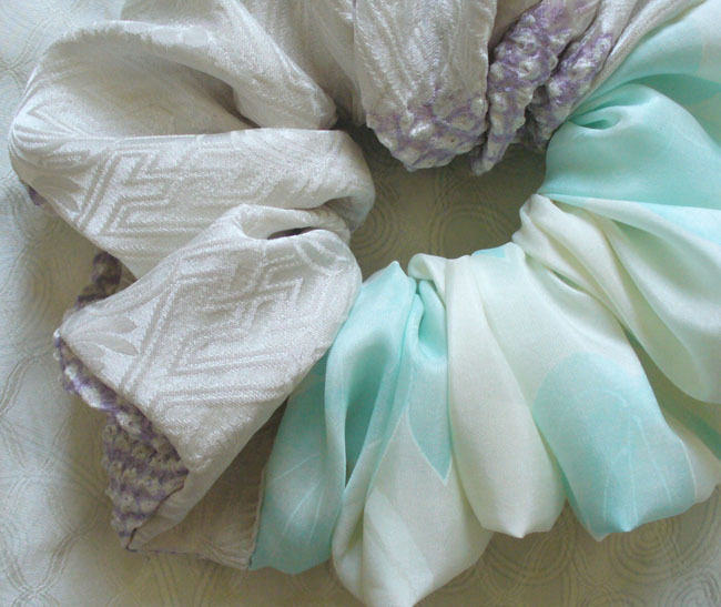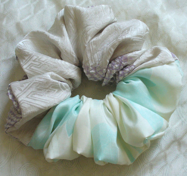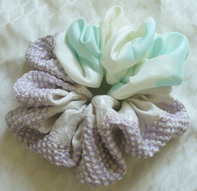 ゴム交換可能 羽裏鹿の子絞り綸子ボリュミー フリル シュシュ 着物絹リメイク 和柄 手縫い ハンドメイド リメイク 着物 和物