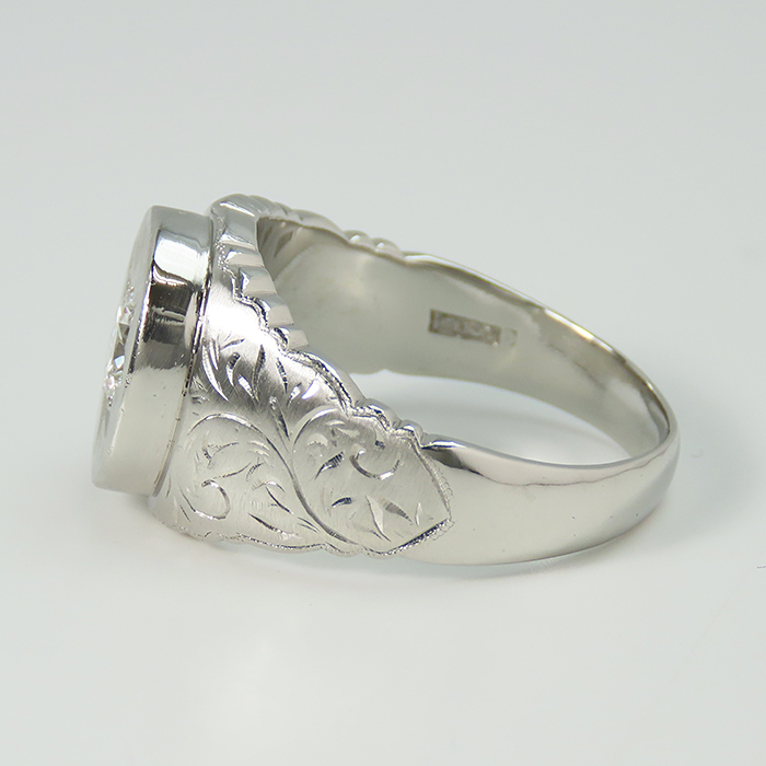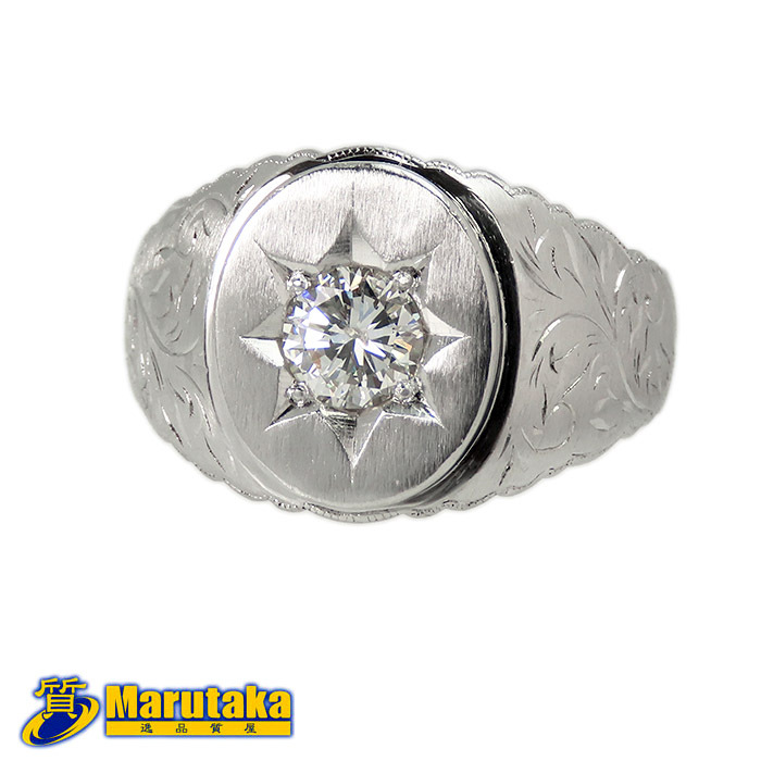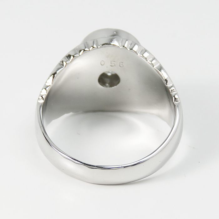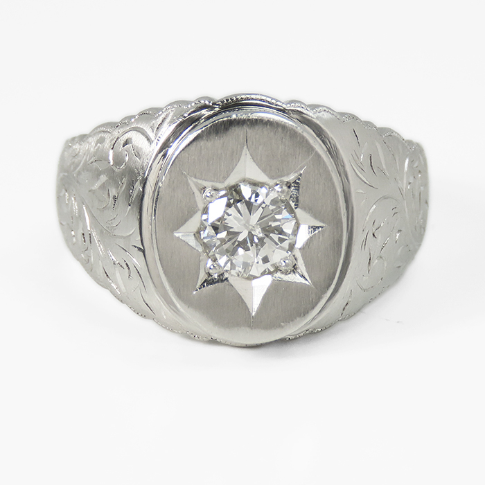 商品説明 | 艶消し加工が施された面の中央に0.56ctのダイヤモンドが後光留めにされています。後光留めは八光留め(はっこうどめ)とも言われる縁起の良い石留め方法です。ダイヤの光を反射させるので、ダイヤモンドが大きく見える効果もあります。 |