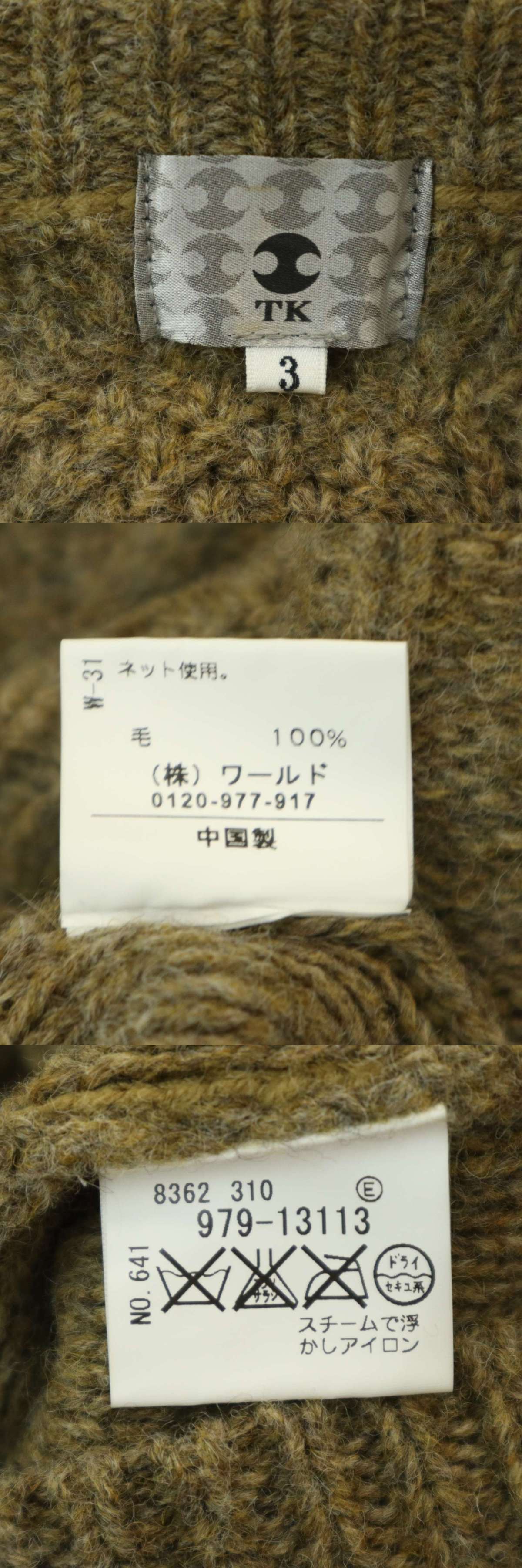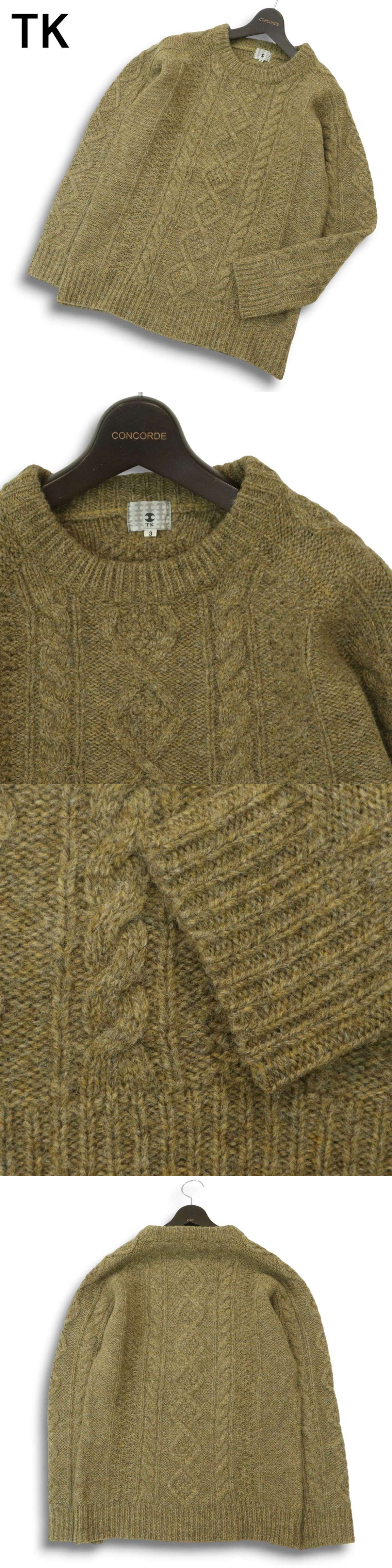 TK タケオキクチ 秋冬 ウール100%★ クルーネック アラン ケーブル ニット セーター Sz.3 メンズ
