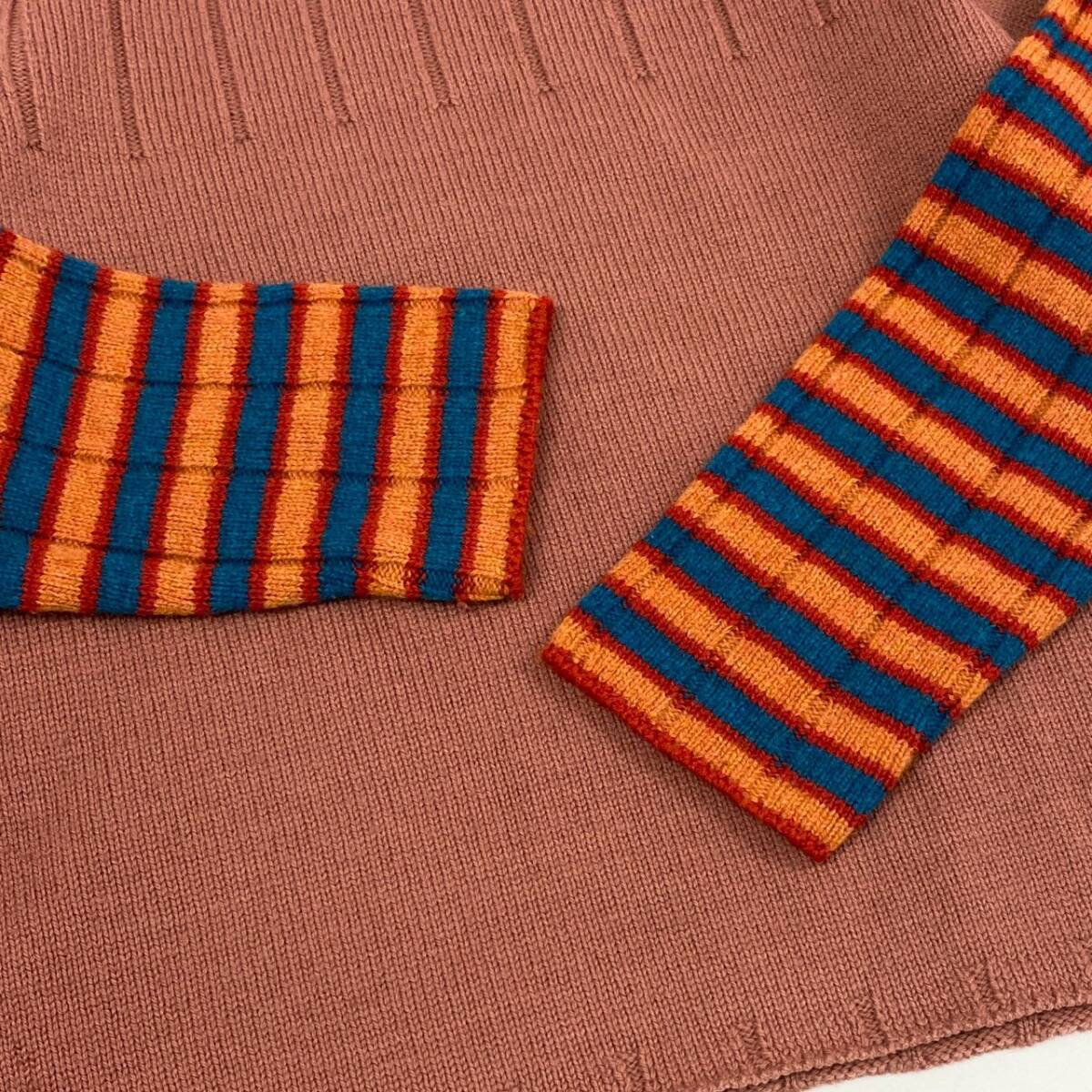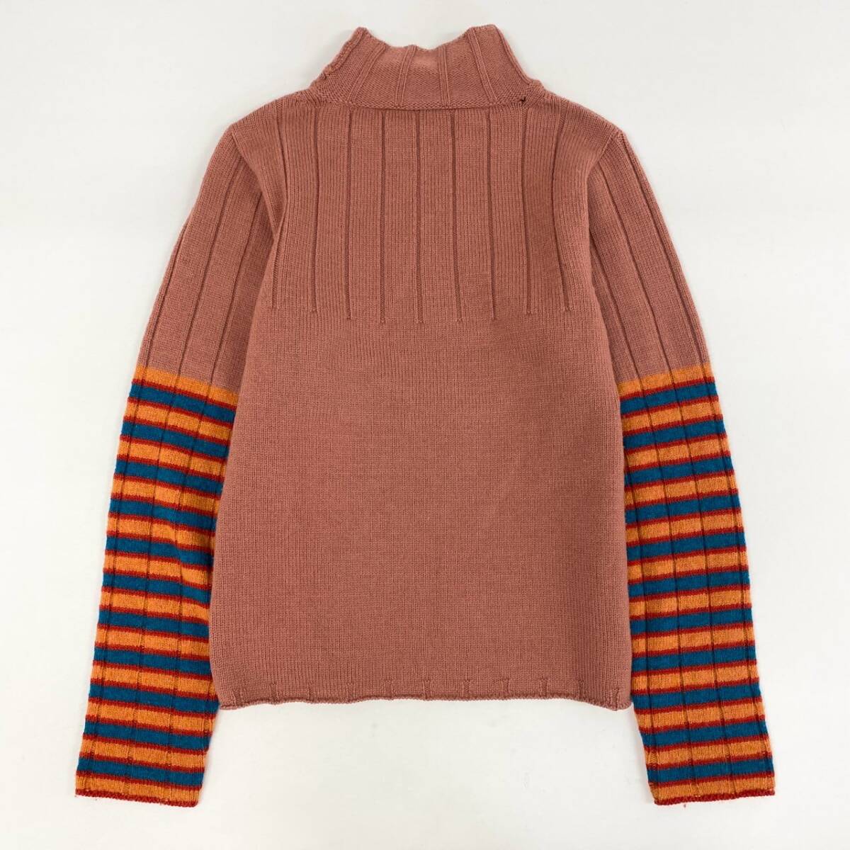 スタッフ商品コメント | ドリスヴァンノッテンらしい色彩センスが光る長袖ニット。落ち着いたローズブラウンをベースに、袖先にはオレンジ・レッド・ブルーのマルチボーダーが施され、遊び心あるデザインに。素材はやや毛足のある上質ウールで、柔らかく暖かい着心地です。タートルネックとリブ編みが立体感を演出し、1枚でも主役になるアイテム。カジュアルからモードまで、幅広いスタイルに活躍します。 |