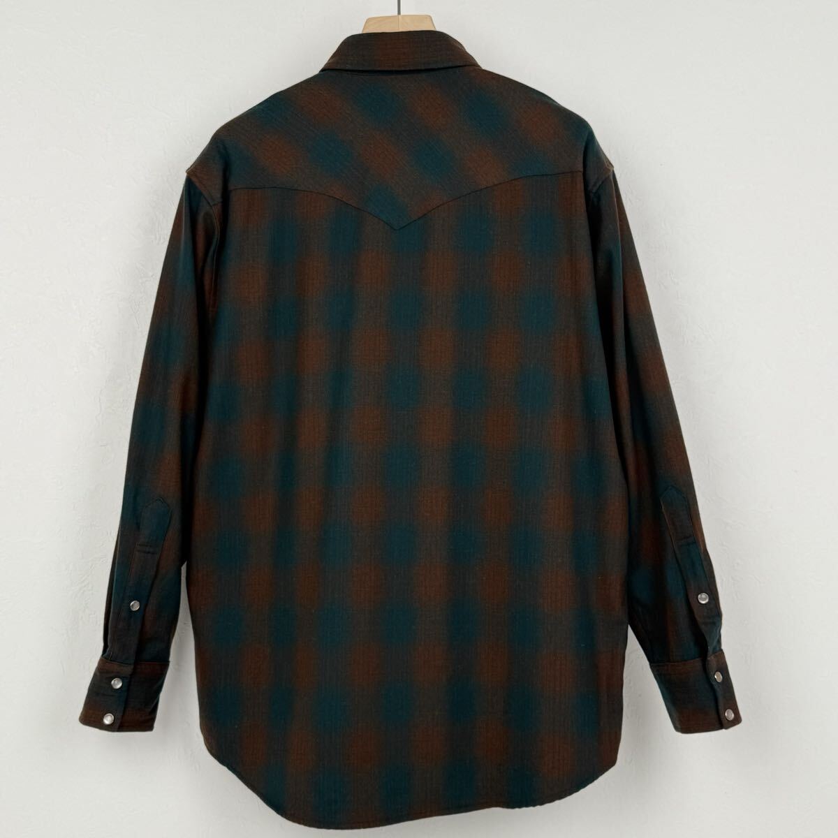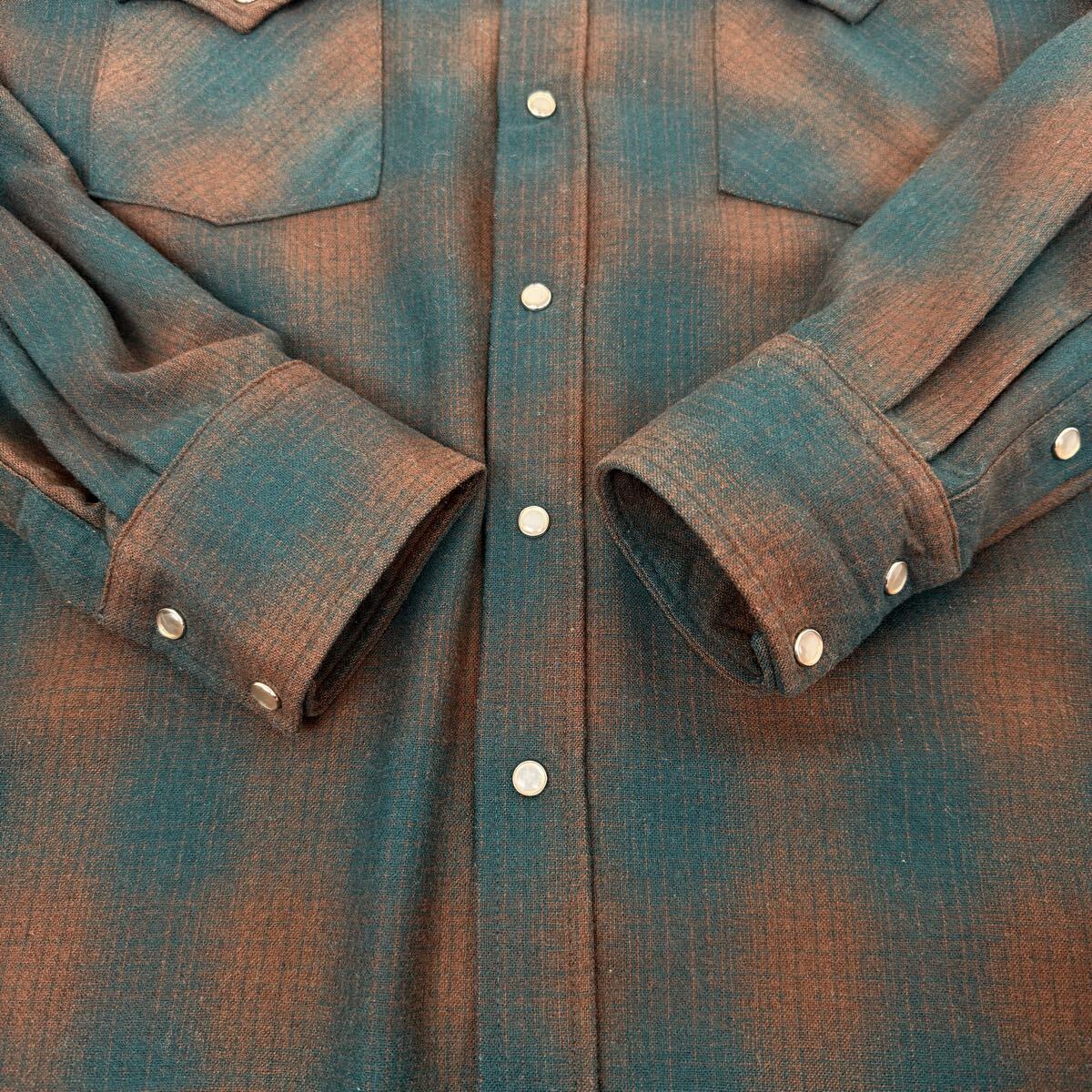 薄めで風合いの良いピュアバージンウール 100%の生地が使用されたブランド定番の一着で、希少カラーであるグリーンベースのオンブレチェックパターンにウエスタンヨークやスナップボタンが映えます。