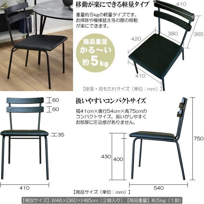 | 【商品特徴】 | ◇アイアンフレームのヴィンテージスタイルでシンプルデザインのダイニングチェアー2脚セット販売。 ・天然木突板積層合板の曲木を使用したナチュラル感ある背もたれ。ブラック色塗装のシックな趣です。 ・お手入れが簡単なブラック色合成皮革(PVCレザー)張地の座面。しっかり硬めの座り心地です。 ・アイアン製の直径2cm丸パイプを使用したフレーム。ブラック色塗装のヴィンテージスタイルで、飽きのこないシンプルデザインです。 ・脚先には、床を傷つけにくい樹脂キャップが付いています。 ・重量約5kgの軽量タイプです。お掃除や模様替え等の際の移動が楽にできます。 ・幅41cm×奥行54cm×高75cmのコンパクトサイズ。扱いがしやすくお部屋に圧迫感がありません。 ・玄関先・ロビー等の待ち合い椅子としてやデスクチェアーとしても最適です。 ・組立不要の完成品で、開梱後すぐにご利用いただけます。 |