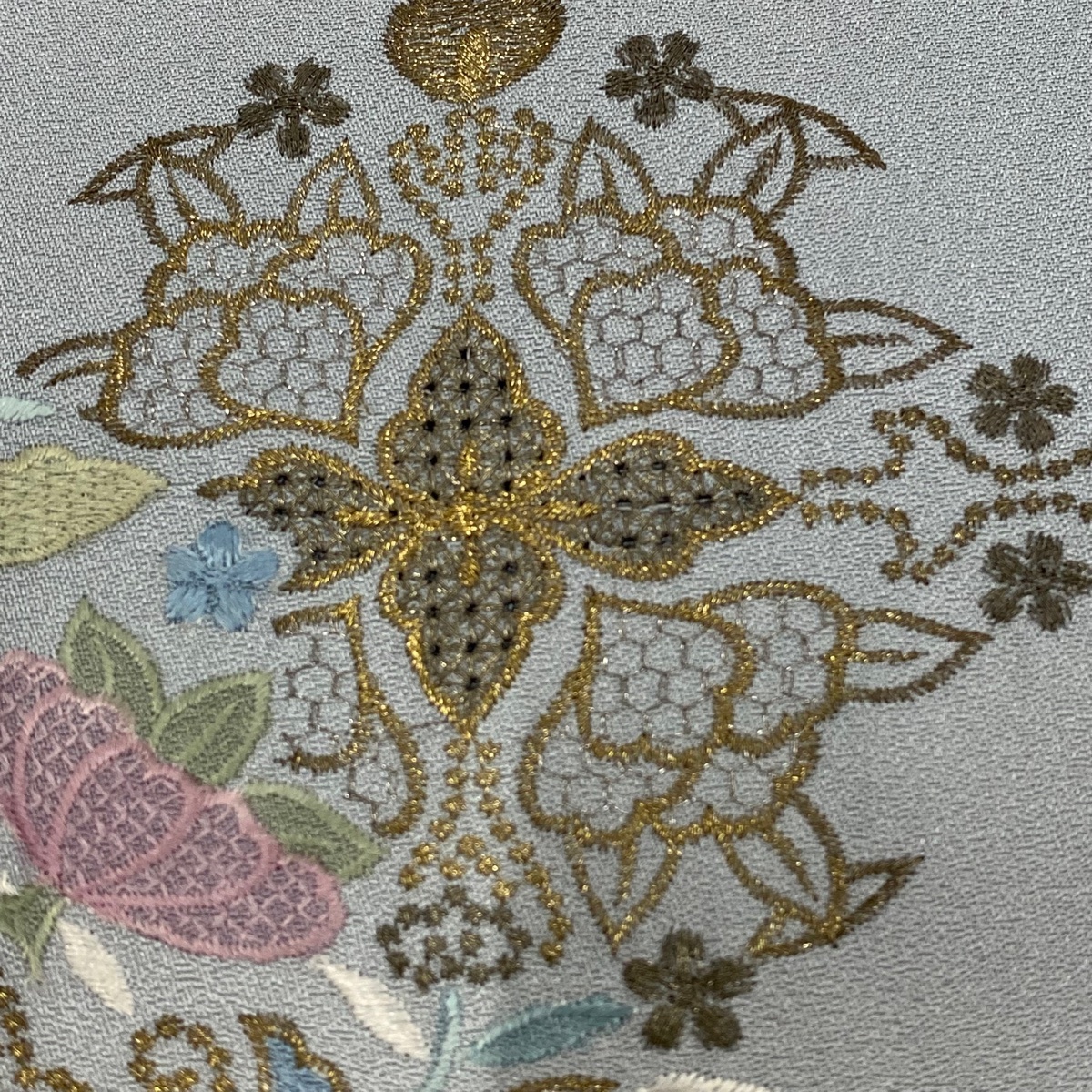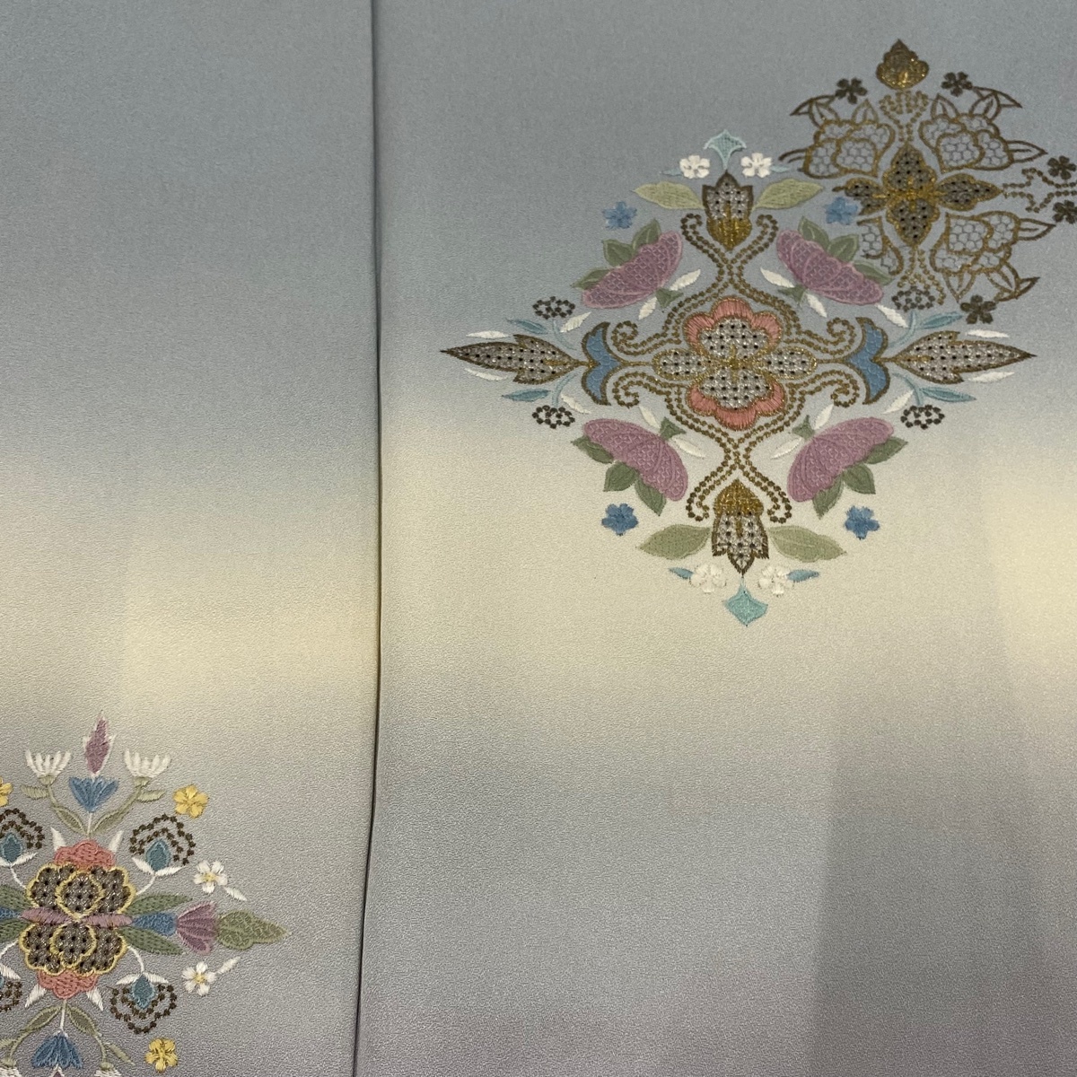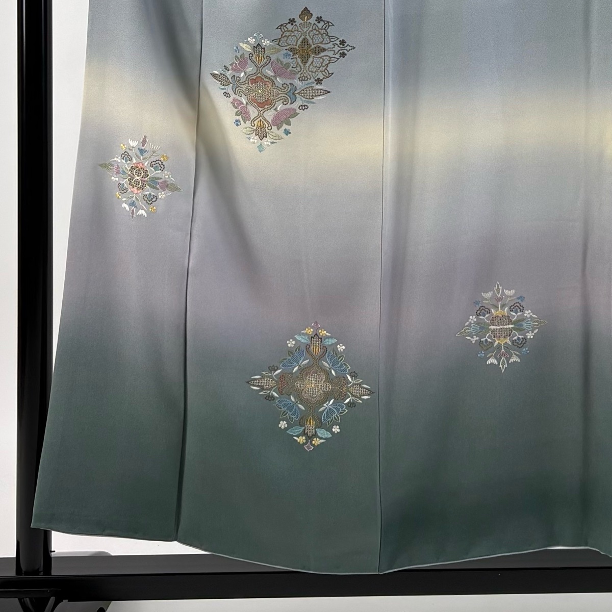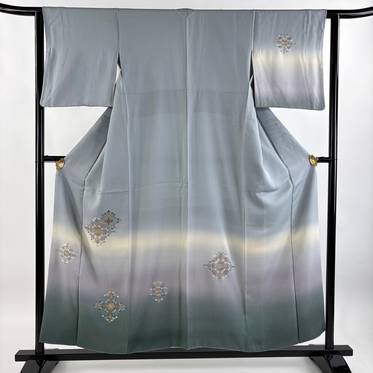 付下げ 秀品 華文 裾ぼかし 刺繍 金銀糸 青灰色 袷 身丈155 裄丈61 S 正絹 【中古】 |