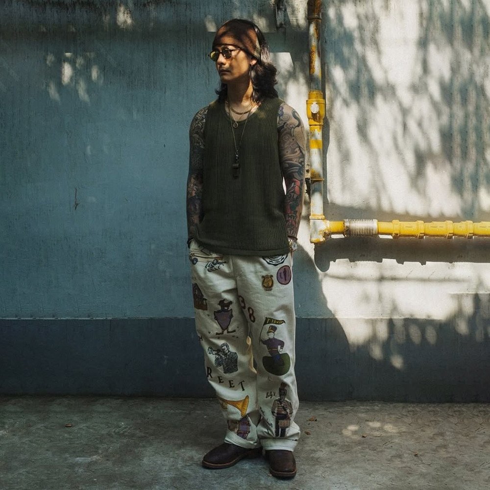 Lサイズ:ウエスト82-89cm ヒップ幅120cm パンツ丈107cm ※サイズは手作業で計測しており誤差が生じる場合がございます。予めご了承ください。 |