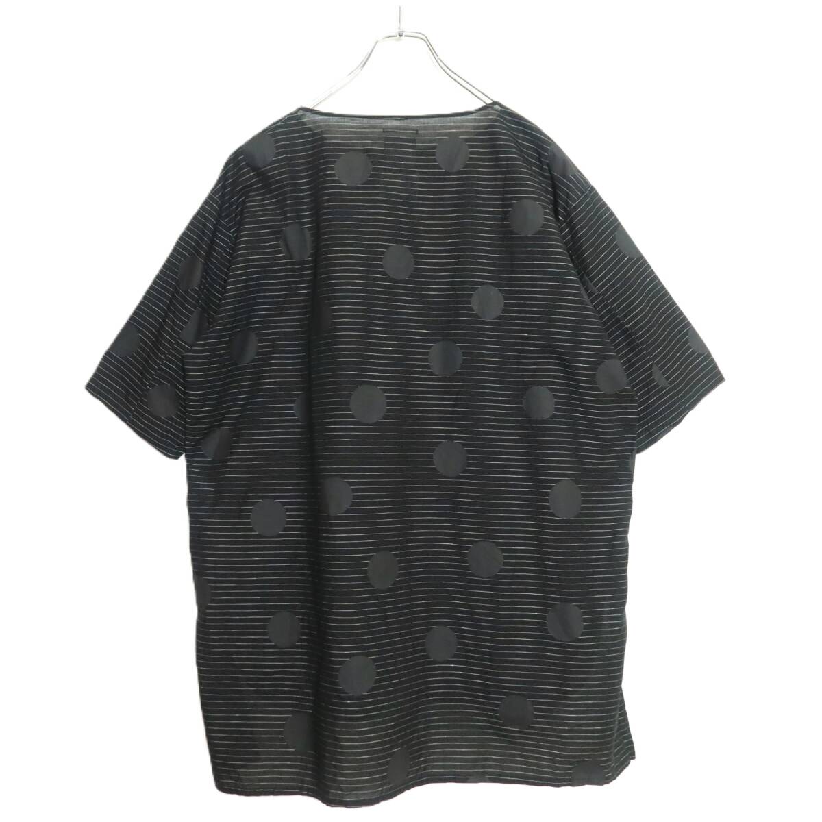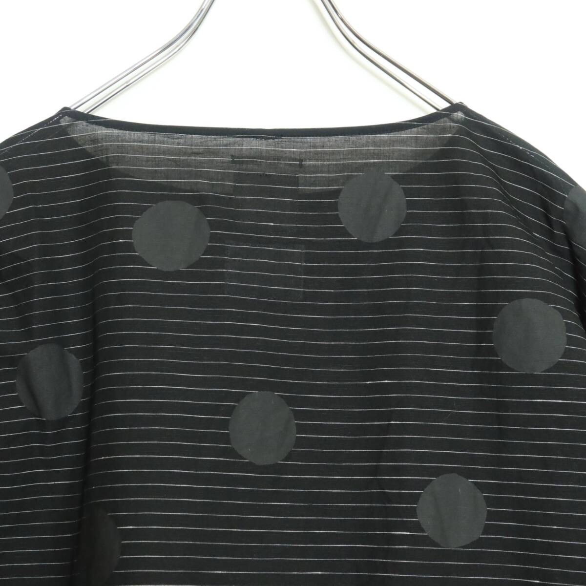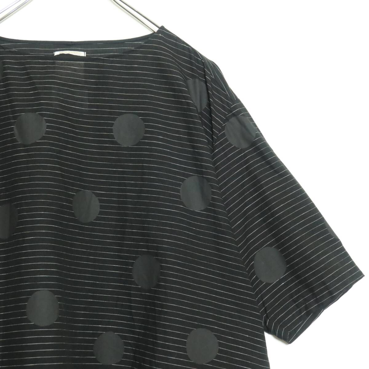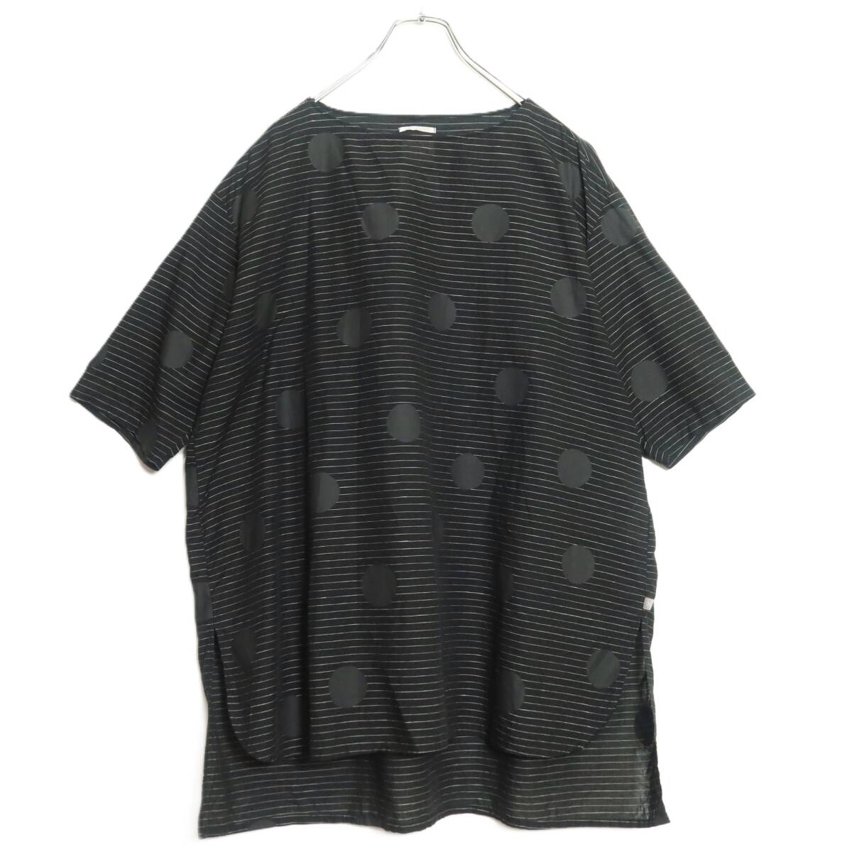 商品説明 | 【実寸約】肩幅54袖丈29.5バスト130着丈82(cm) 【サイズ表記】表記なし。実寸をご参照ください。 【素材】綿55 麻45 【状態】使用感少なめの美品 【デザイン】黒系 綿麻混の涼しげな生地を使用した半袖チュニックです。 ボーダーとドット柄の組み合わせが素敵です♪ 前身頃の丈が後ろより少し短くなっています。 薄手/ボーダー柄・ドット柄 |