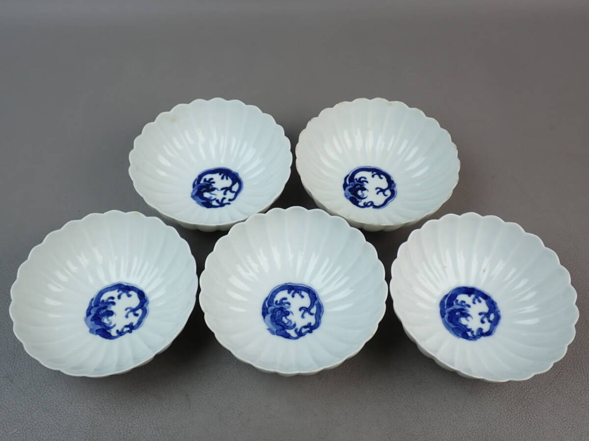 【骨董・茶道具】★古い 伊万里焼 古伊万里★★染付龍文輪花なます皿 5客 go035ub 向付 和食器