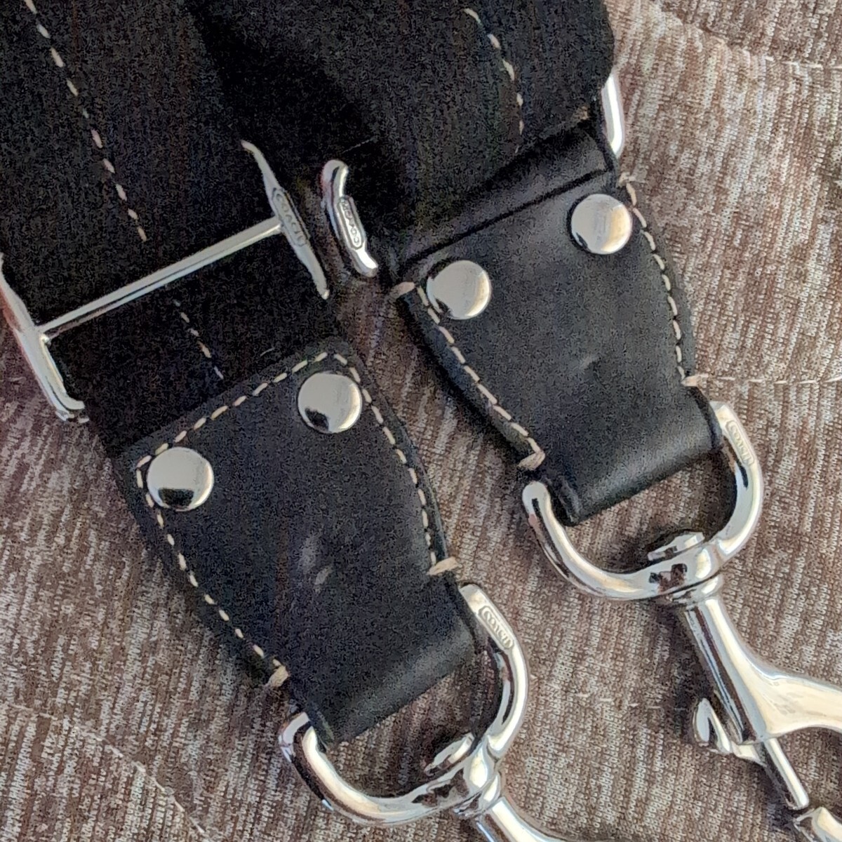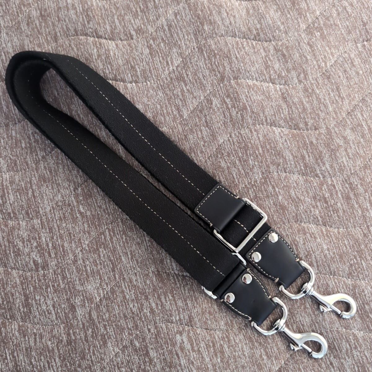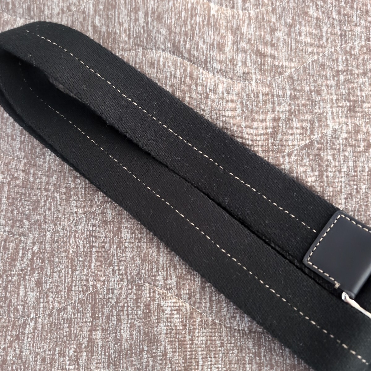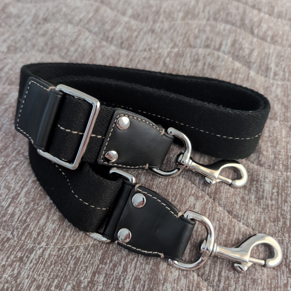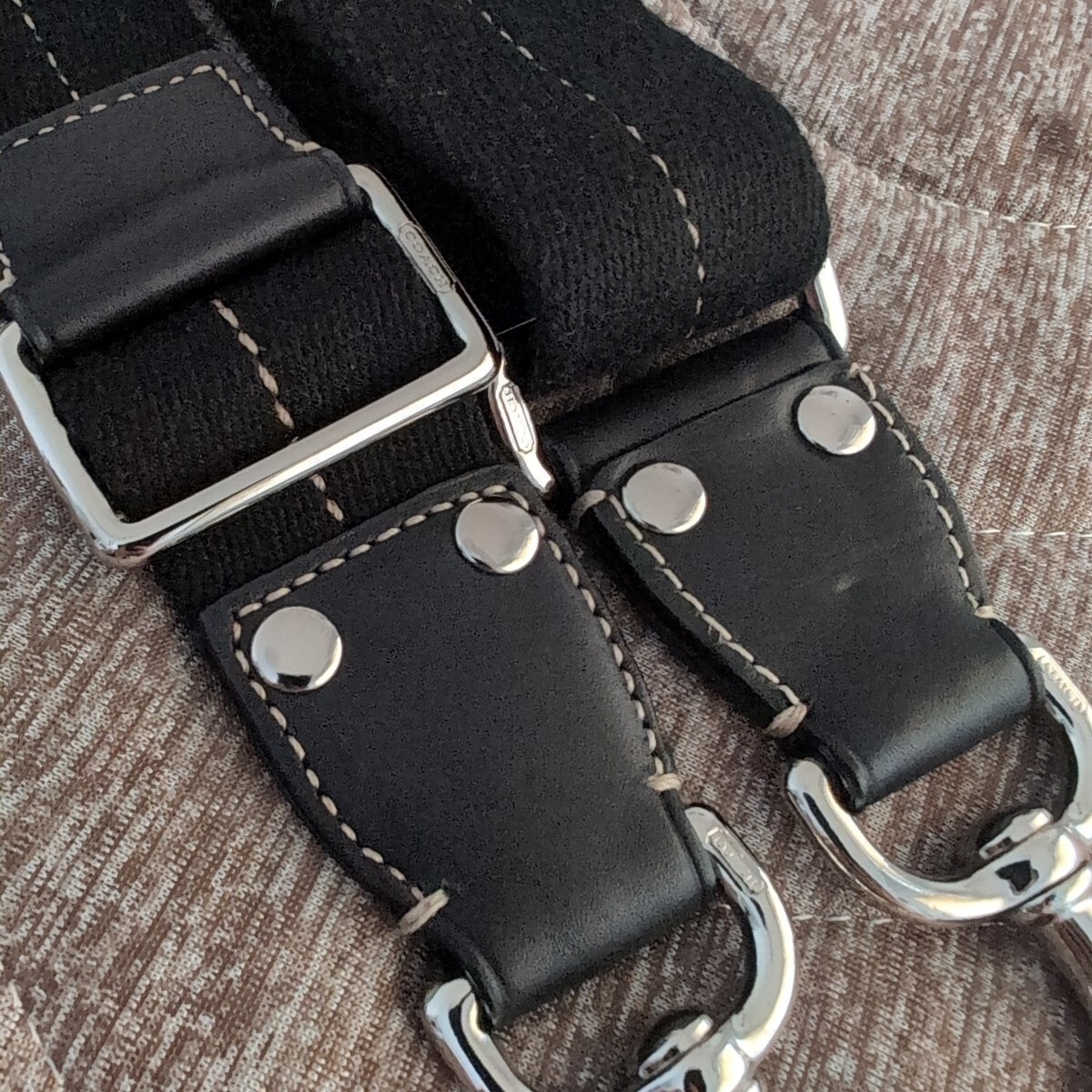 厚手のしっかりしたキャンパス地にステッチが入ったデザインです。金具もロゴ入りで重厚感のある作りです。