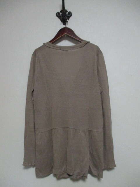 商品紹介 | 薄い茶色のVネックカーディガンです。 少し長めの丈です。 ウエストの少し下に切替えがあります。 エリから切替えまではボタンに沿ってフリルが付いています。 また、袖口もフリルっぽい形です。 《素材》 絹55% 麻45% (60825) |