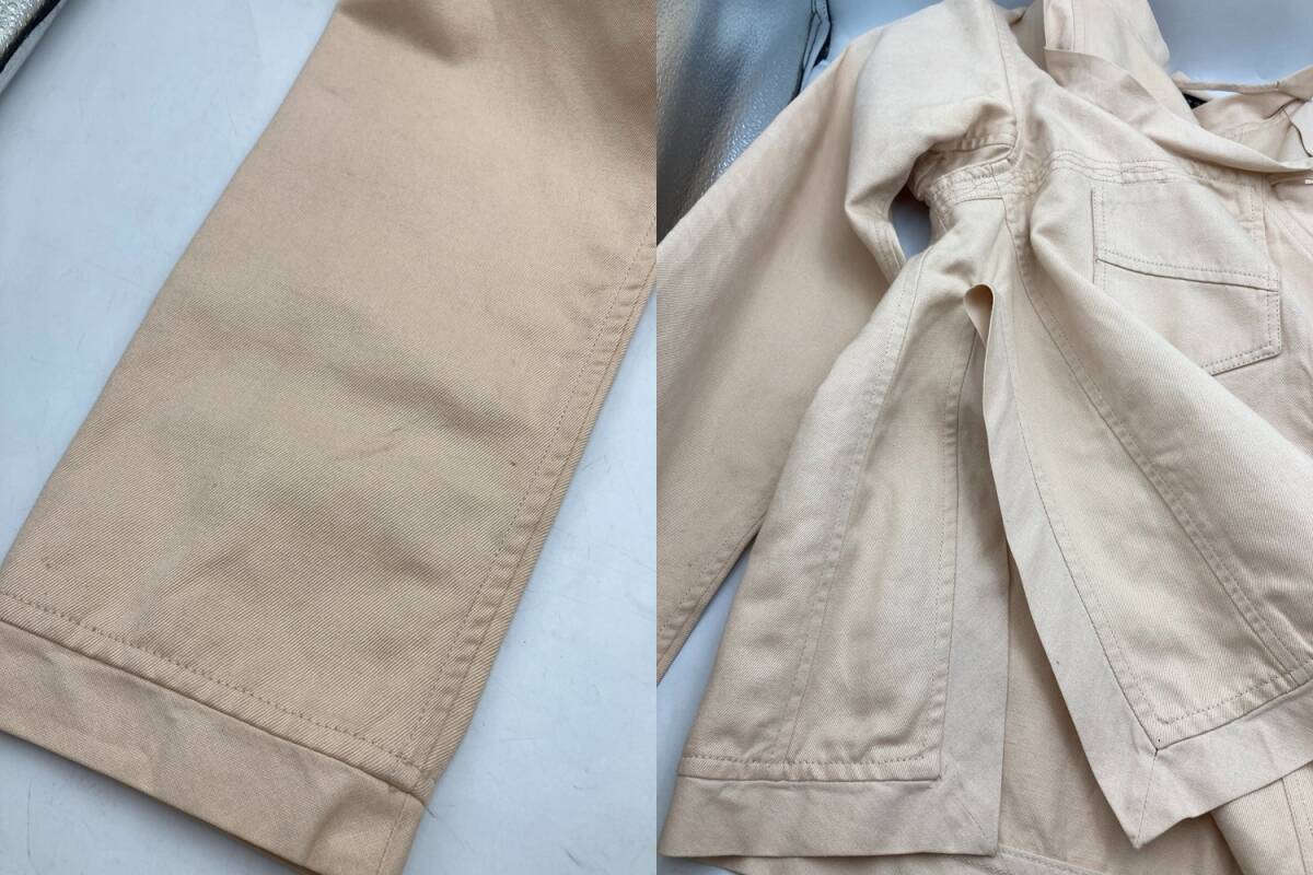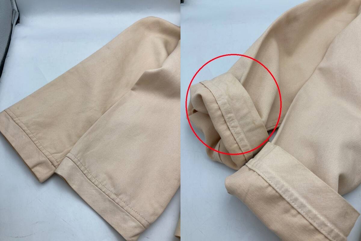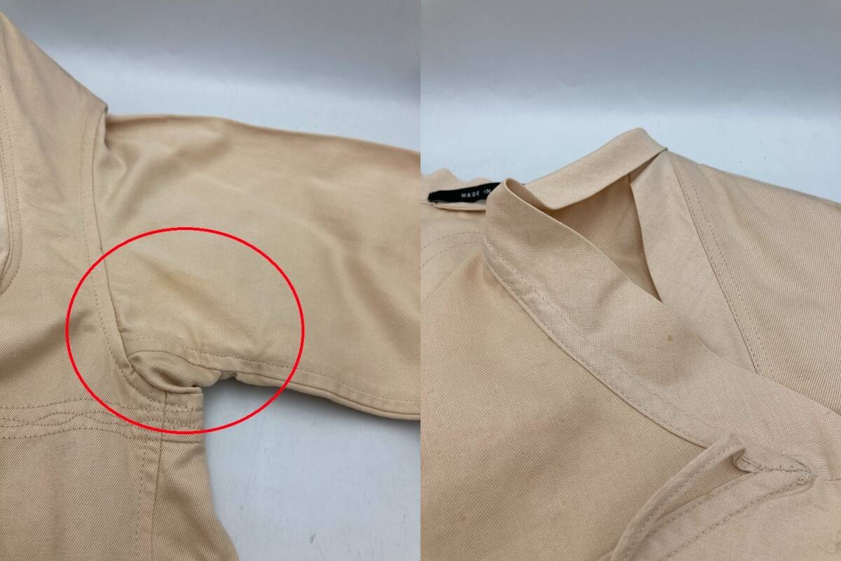 状態 | 着用感がございます。 袖口、脇に大きめのシミ、裏側脇部分に黒い汚れ、細かな小さいシミや汚れが多数ございます。 | |