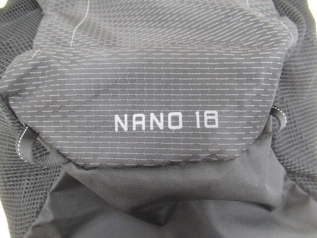【状態詳細】日帰りのハイキングで防寒着やギアを持ち運ぶ相棒が必要なら、ナノ18がおすすめです。容量は18リットルで、フロントにはオーガナイザー付きのファスナーポケットを装備。