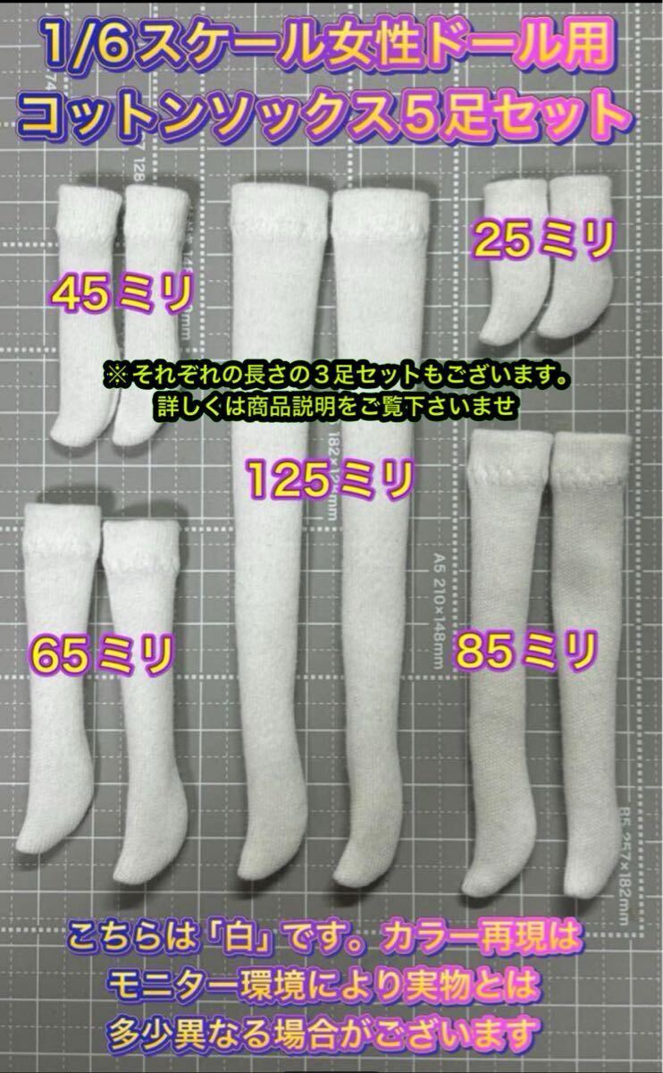 リカちゃん、ジェニー、ネオブライス、アイシードール 、オビツ27女性ボディ、ハッシュタグボディなどが着用出来る、ごくシンプルな綿のソックス長さ違い、平置きで約125ミリ、85ミリ、65ミリ、45ミリ、25ミリの5足セットです。