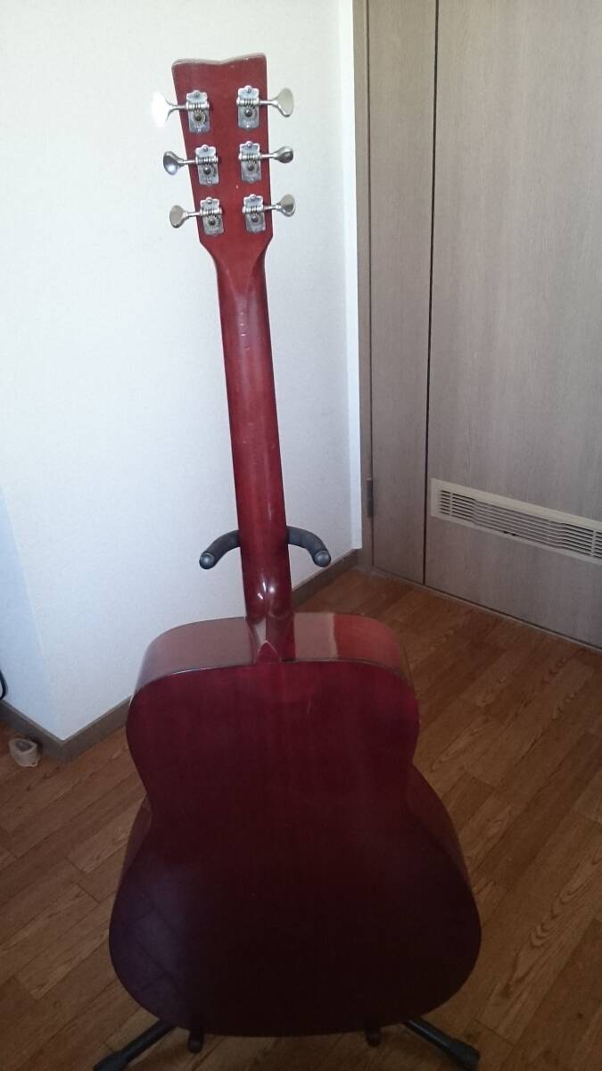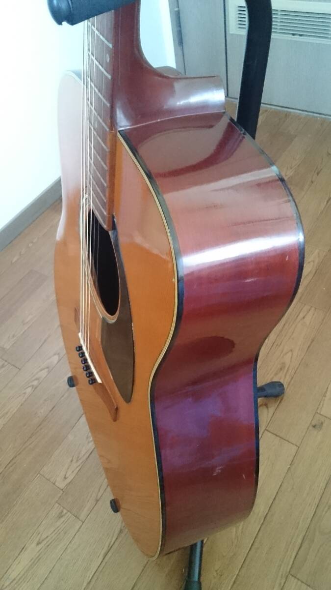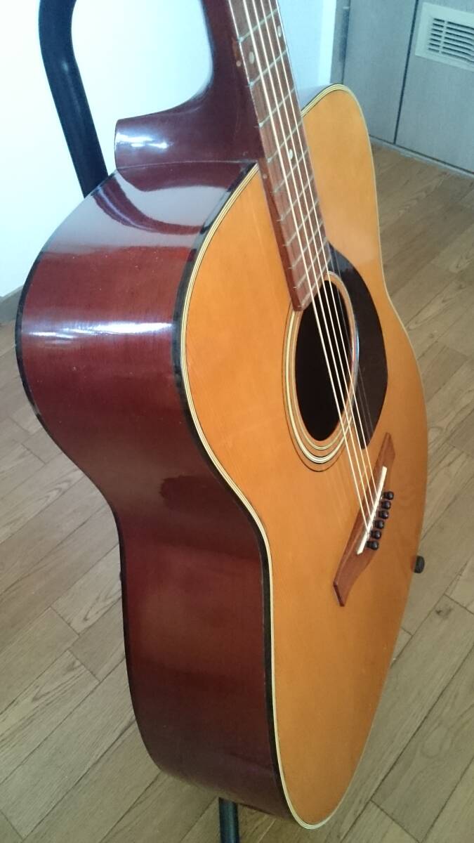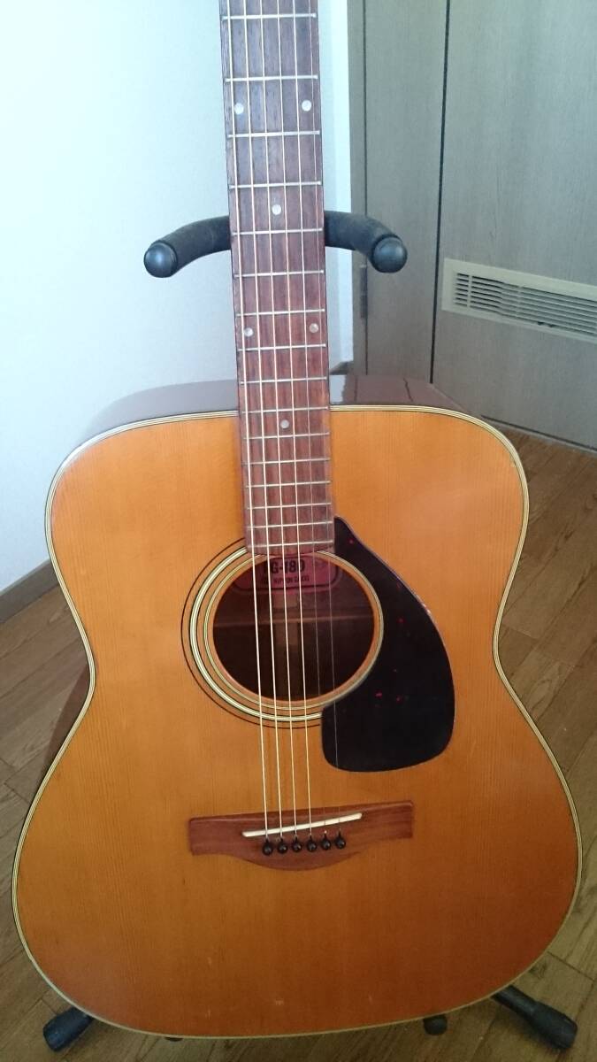 YAMAHA FG-180赤ラベル アコースティックギター の出品です。60年代に製造されたと思われる横文字ヘッドロゴの稀少のジャパビンです。経年の傷少なく外観の綺麗な個体です。演奏には問題ありません。弾き込まれていますので良い音します。オールオリジナルです。フレット山は8割ぐらいです。ネックは真っ直ぐ、ロッド余裕あります。12フレットの弦高は1弦は2.5mm、 6弦は3mmです。弾きやすいです。Yamahaの純正ペグは綺麗、チューニング問題ありません。サドル、ナットは牛骨が仕様されています。フレット磨きボーデイクリーニング済みです。ボーデイトップ膨らみなし、ブリッジ浮きなし、タバコの臭いはありません。すぐ使えます。