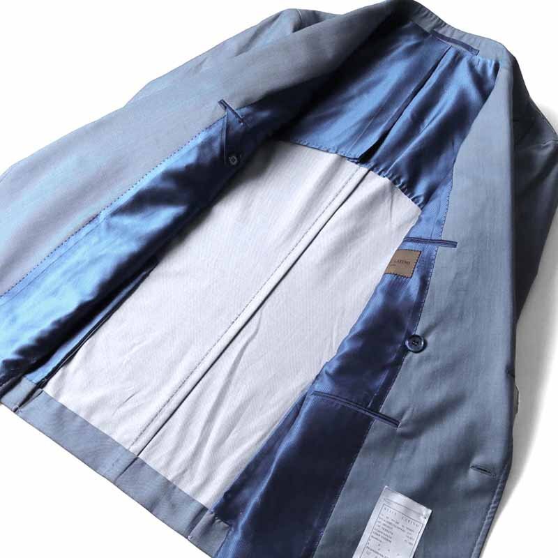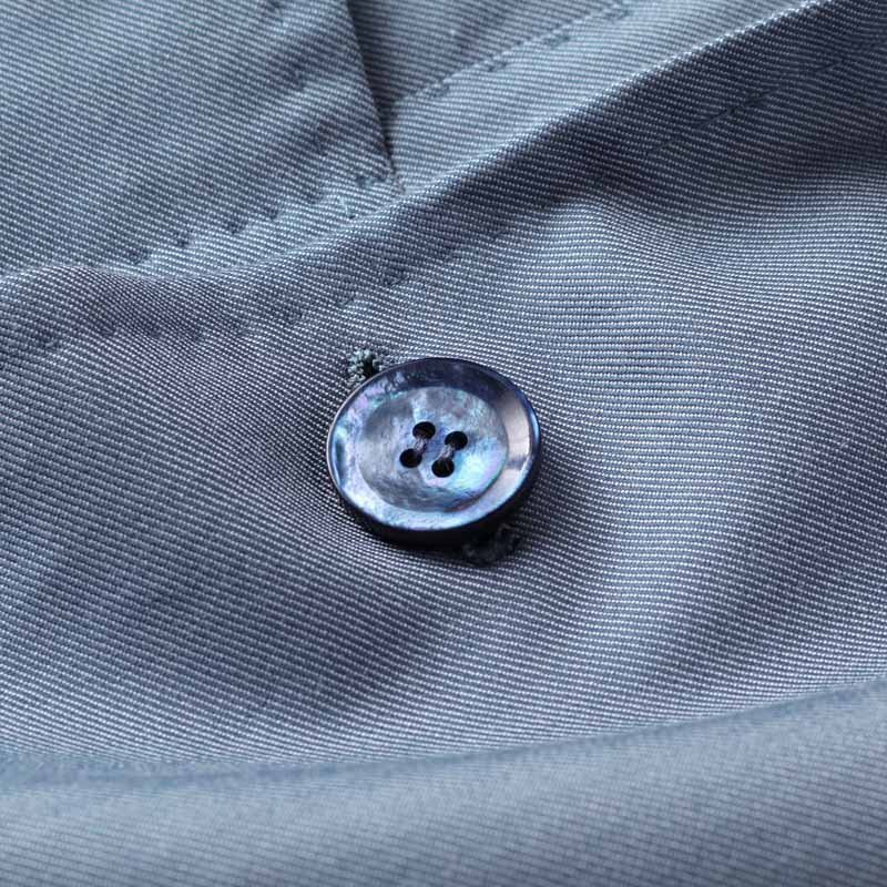 ・肩から首にかけての吸い付くようなフィット感の美しいのぼり、立体的でふんわりと仕上がったふくらみのあるラペル、ナチュラルな弧を描く前振り袖、ウエストが程よくシェイプされた美しいシルエット、上質な芯地を使用した柔らかなショルダーライン(マニカカミーチャ)など、伝統的なナポリ仕立てをベースにハンドを駆使してつくられています。