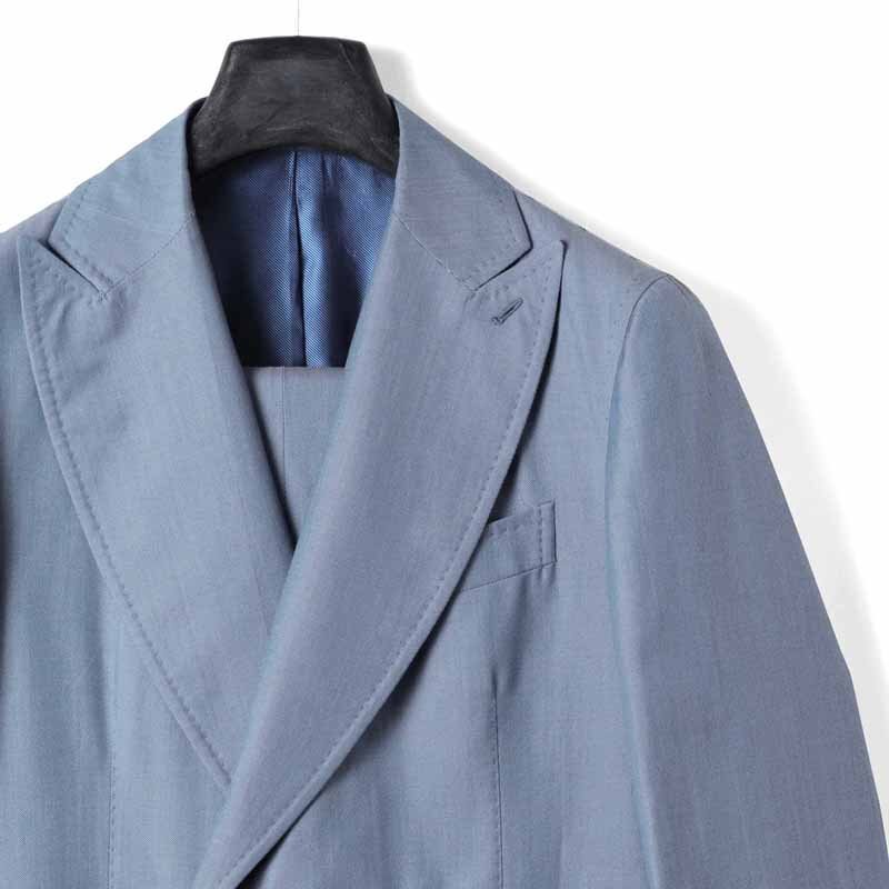 ・男らしいラペルデザインとは裏腹に、薄手の芯地を用い、やや着丈の短いコンパクトなシルエットに仕立てることで、軽快に着られるモダンなダブルスーツに仕上げられています。