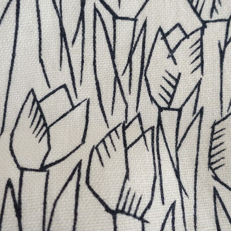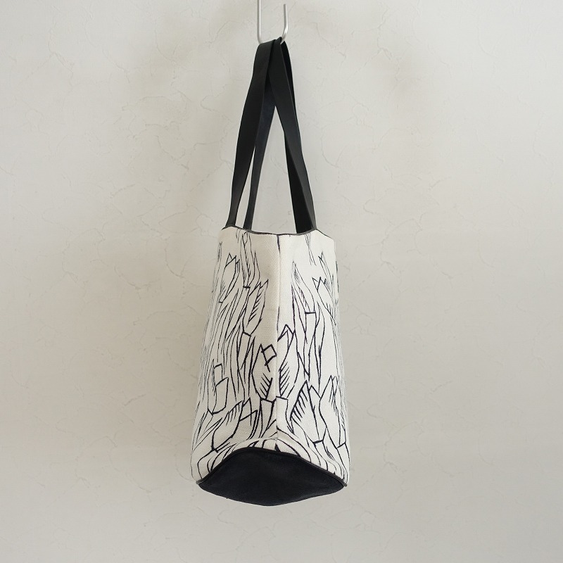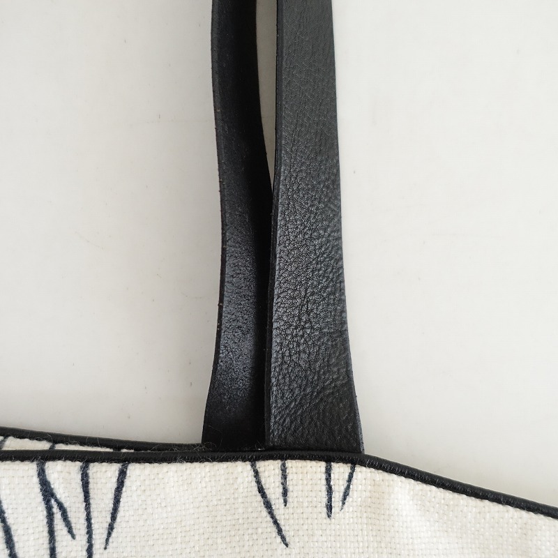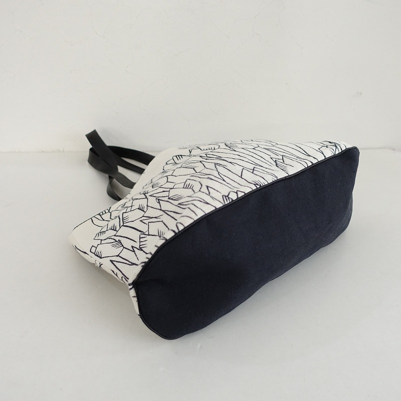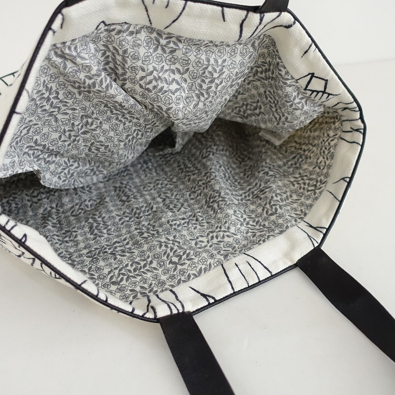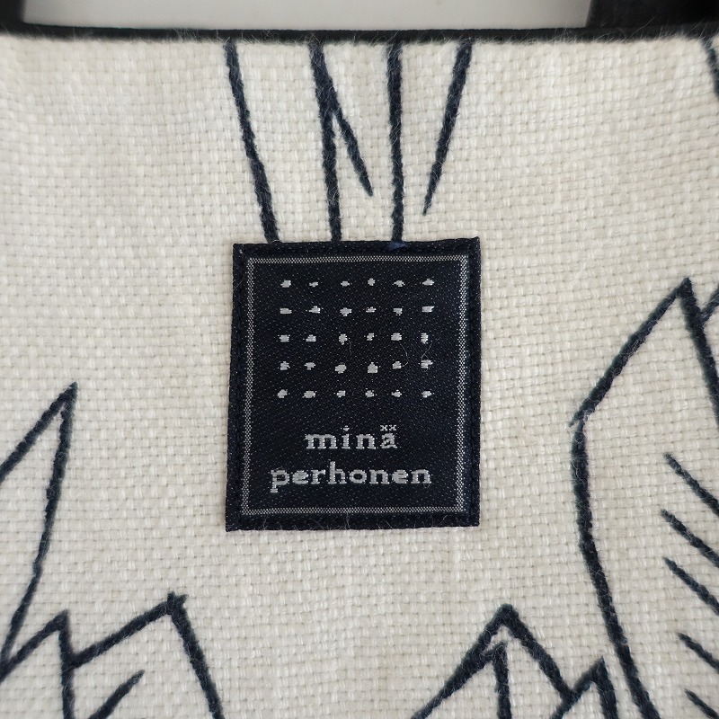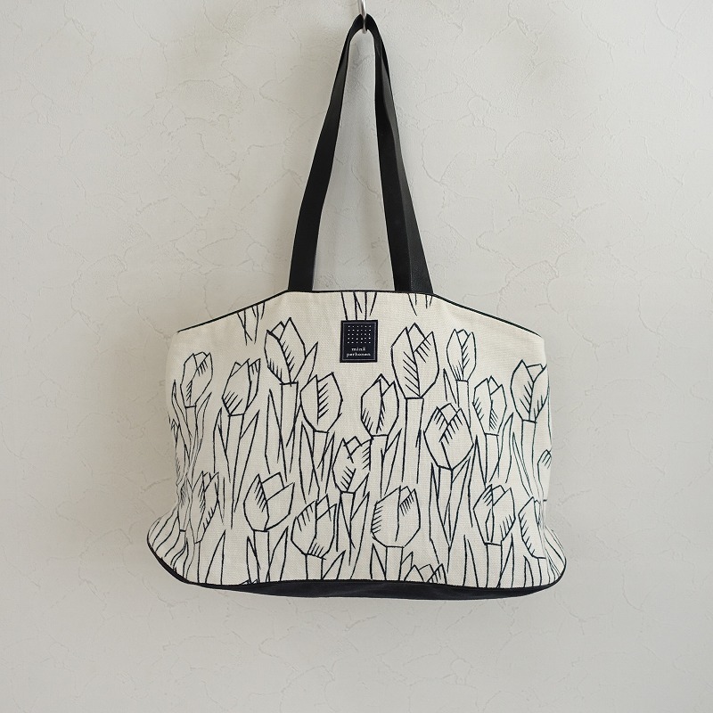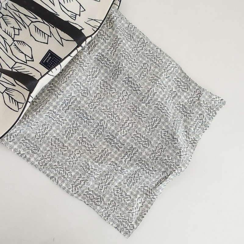 mina perhonenのtulipani laiva ライババッグです。カラーはライトベージュベースにブラックで、「tulipani」のテキスタイルが施されたデザインです。内側にはグレー系sleeping roseの裏地&オープンポケットが2つあり、素材は表生地が麻100%、裏生地は綿100%です。 |