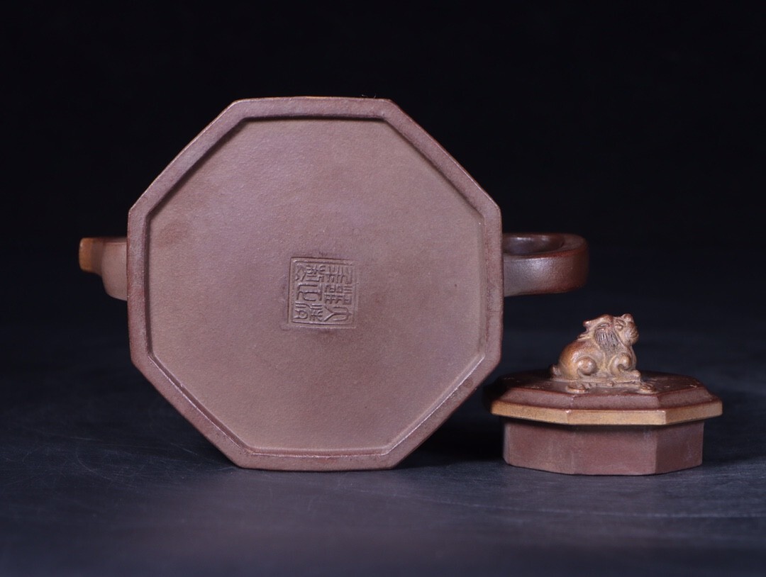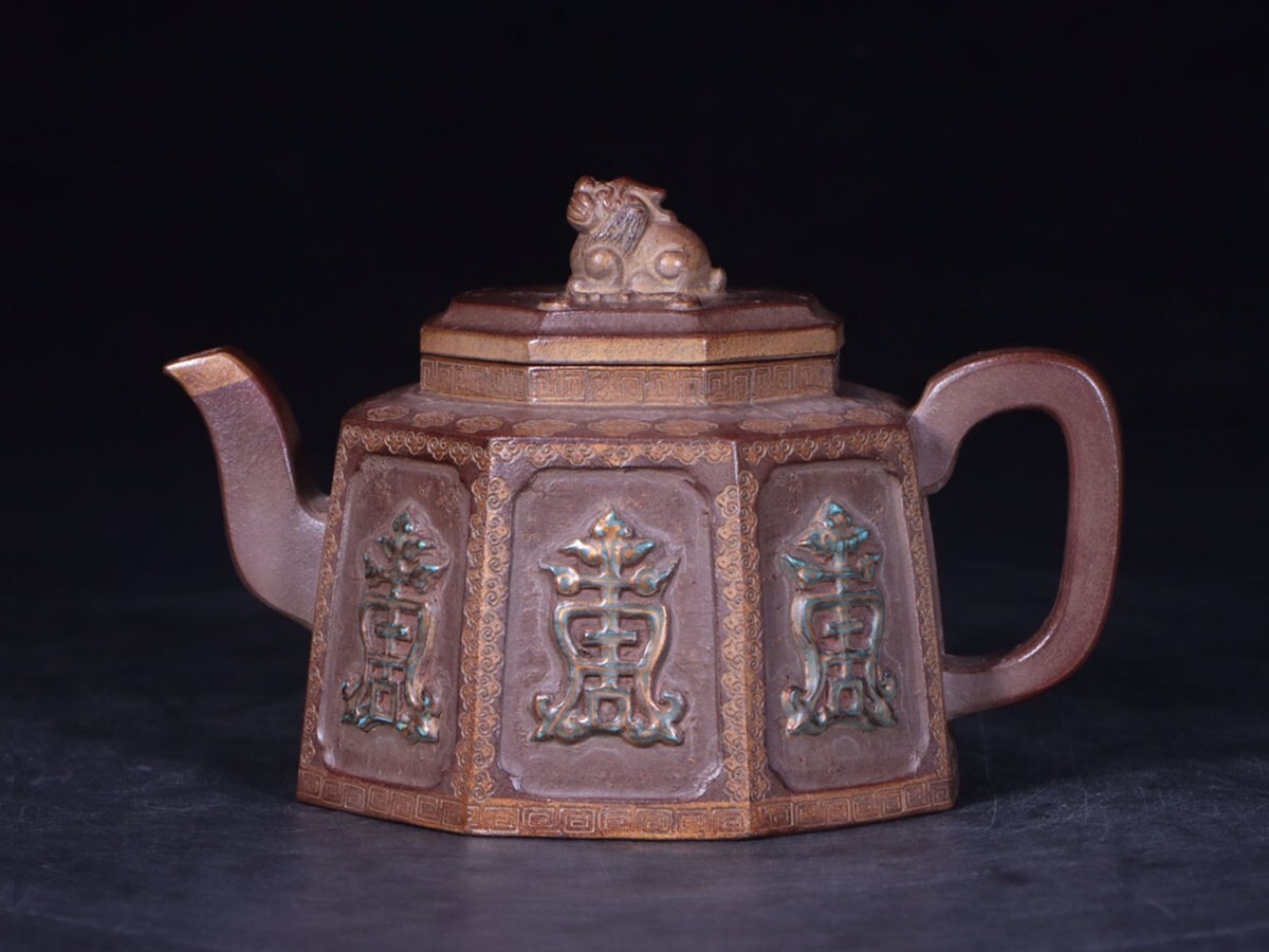 「紫砂彫 堆塑描金八方紫砂茶壺 大清雍正年製銘 清時代」陶磁器 急須 茶道具 古賞物 中国古美術 旧蔵出