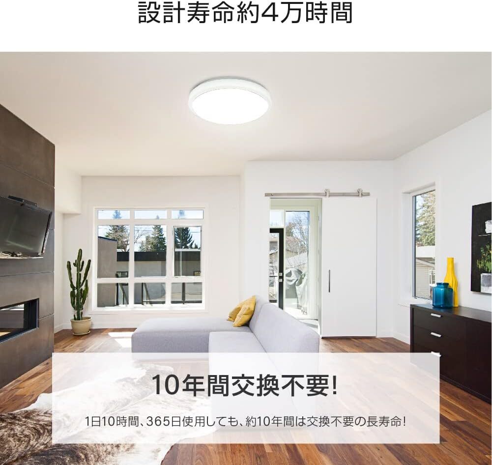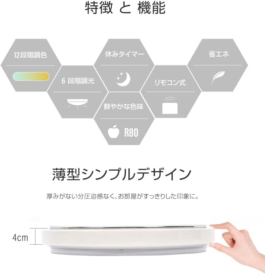 【製品仕様】商品サイズ:Φ43xH8cm / カラー:ホワイト / 調色:12段階/調光:6段階 / 定格光束:4800lm / 色温度:3000k-6500k/ 消費電力:40W