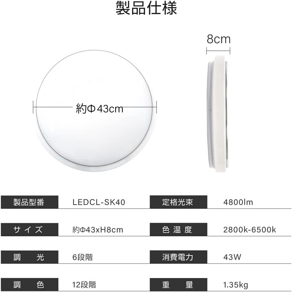 LEDシーリングライト 照明 リモコン ホワイト 明るい 調光 調色 ライト リビング 子供部屋 寝室 和室 洋室 インテリア照明 ledcl-sk40