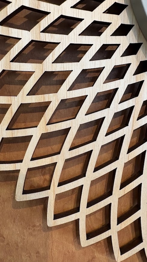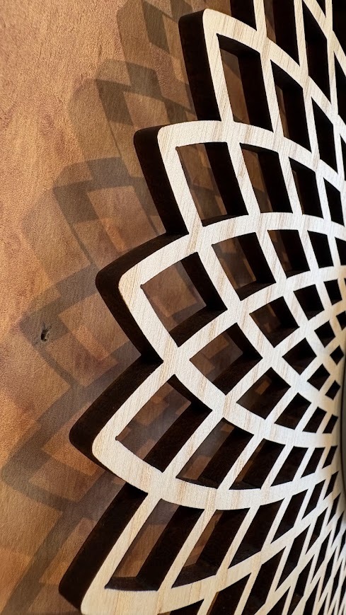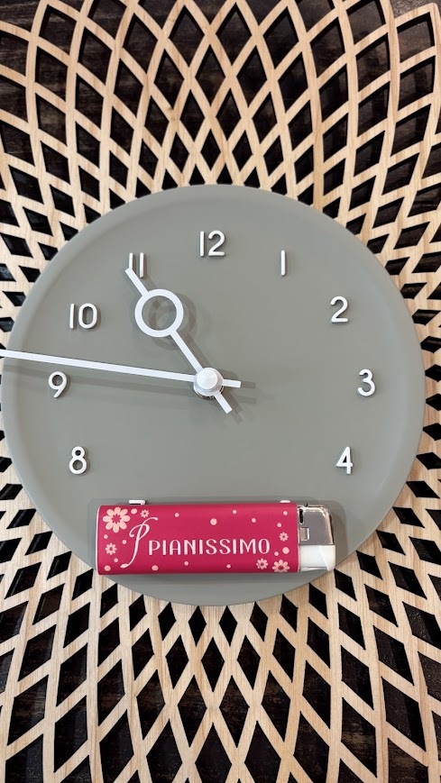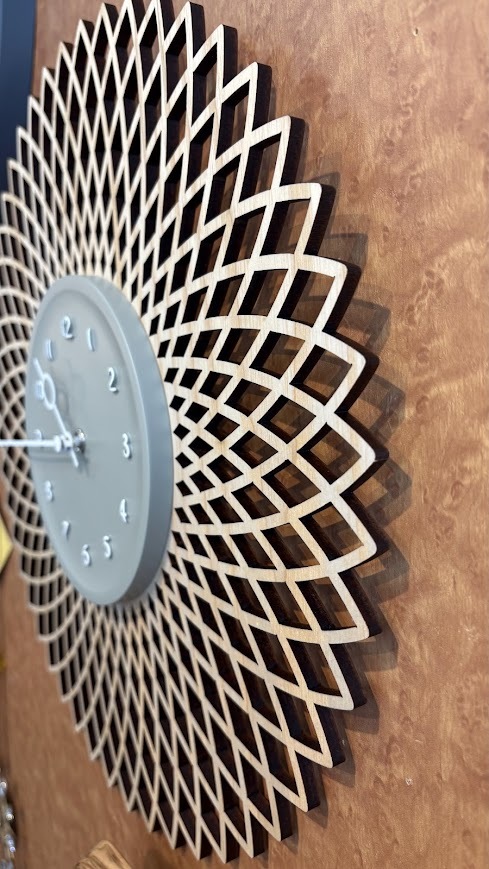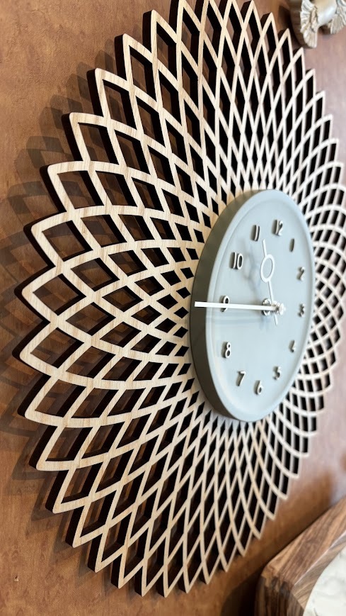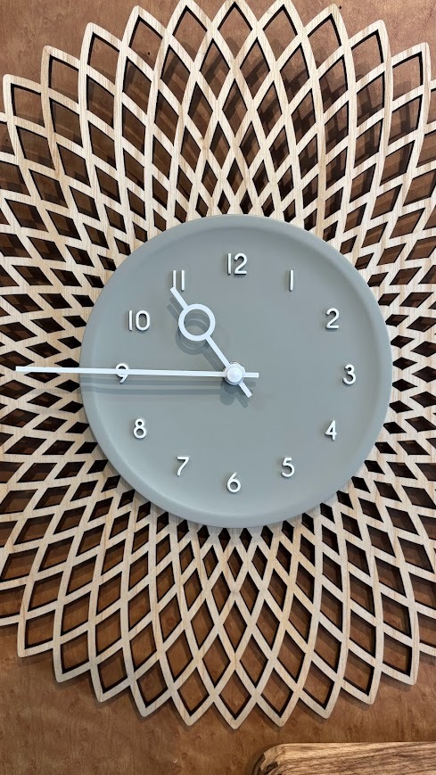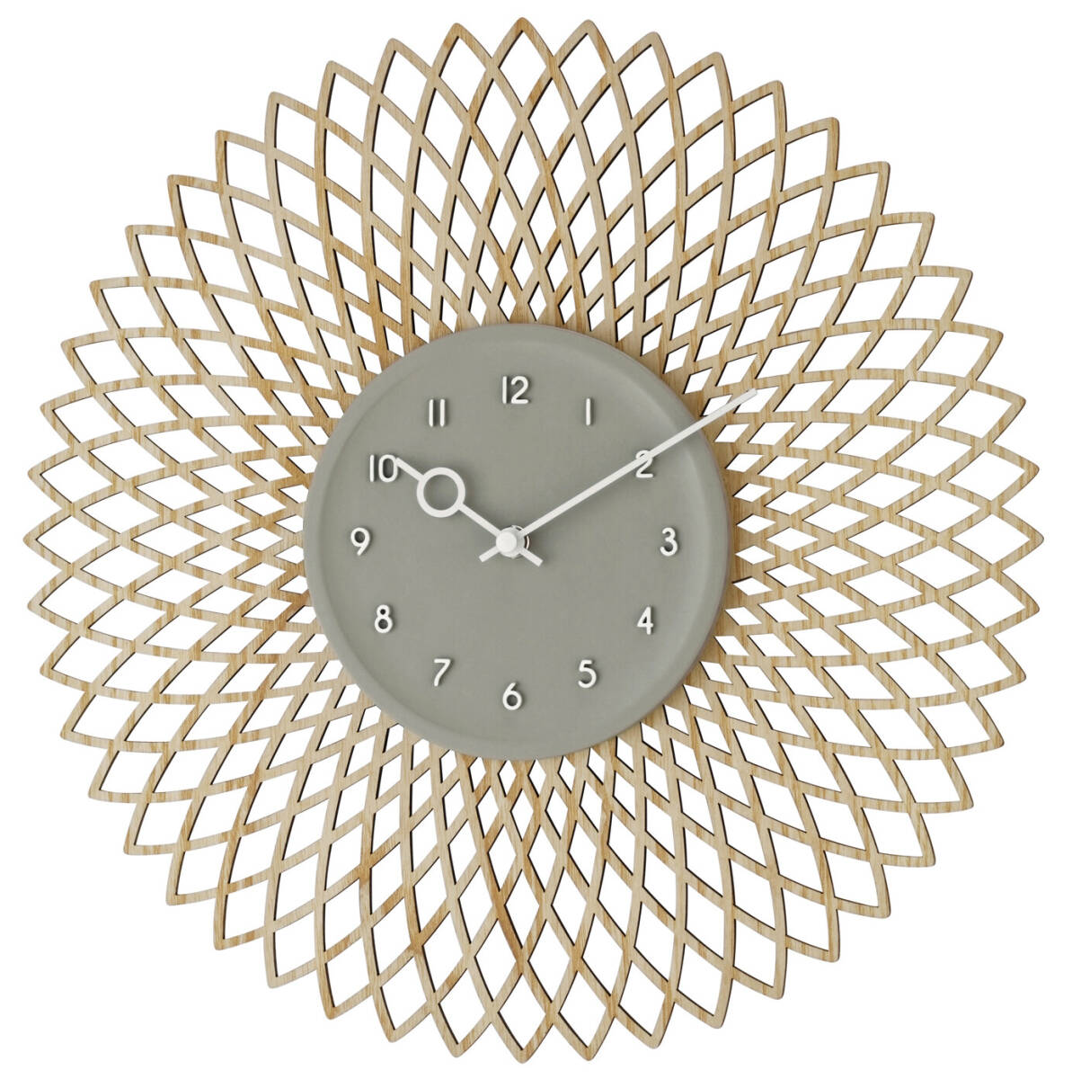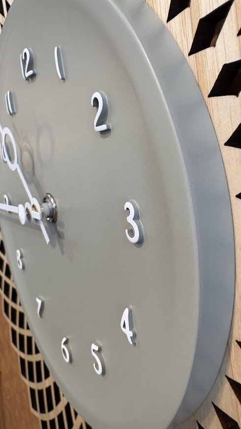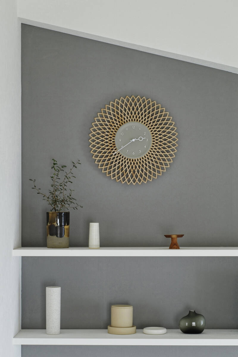 切り絵のようなジオメトリックデザインのウッドに立体的なグレーの文字盤を重ねたウォールクロック。大胆なデザインにウッドのあたたかみを添えた、コントラストの効いたルックスです。