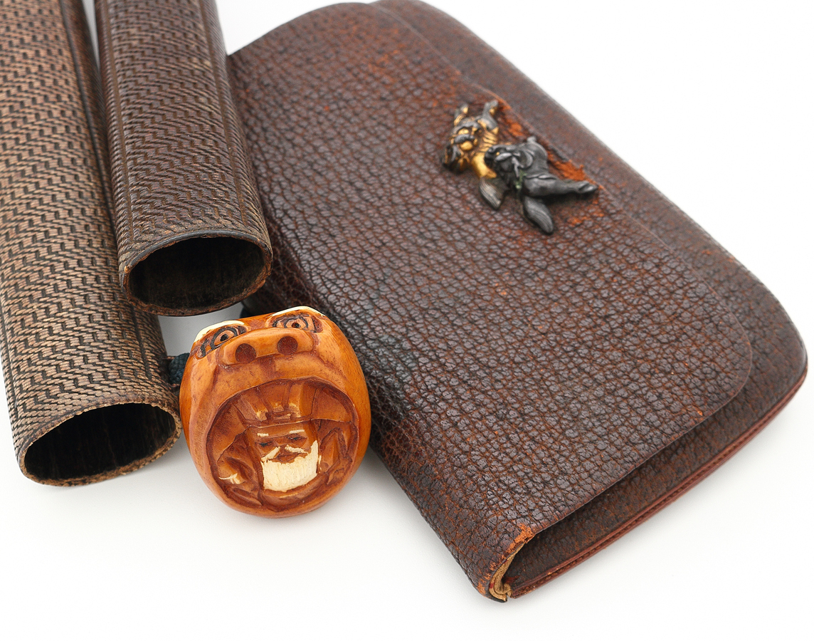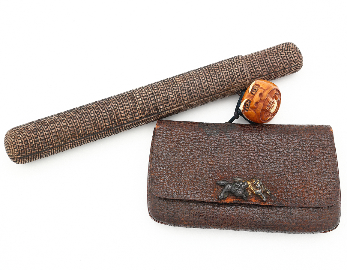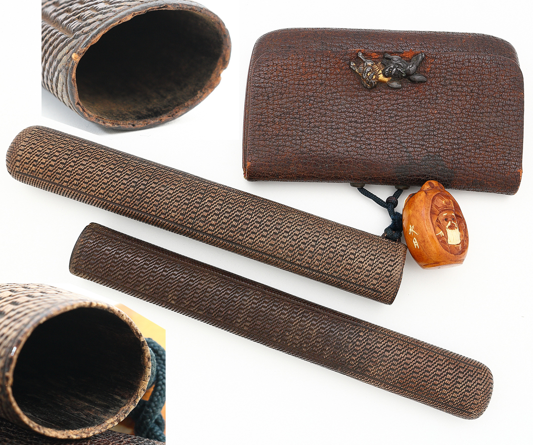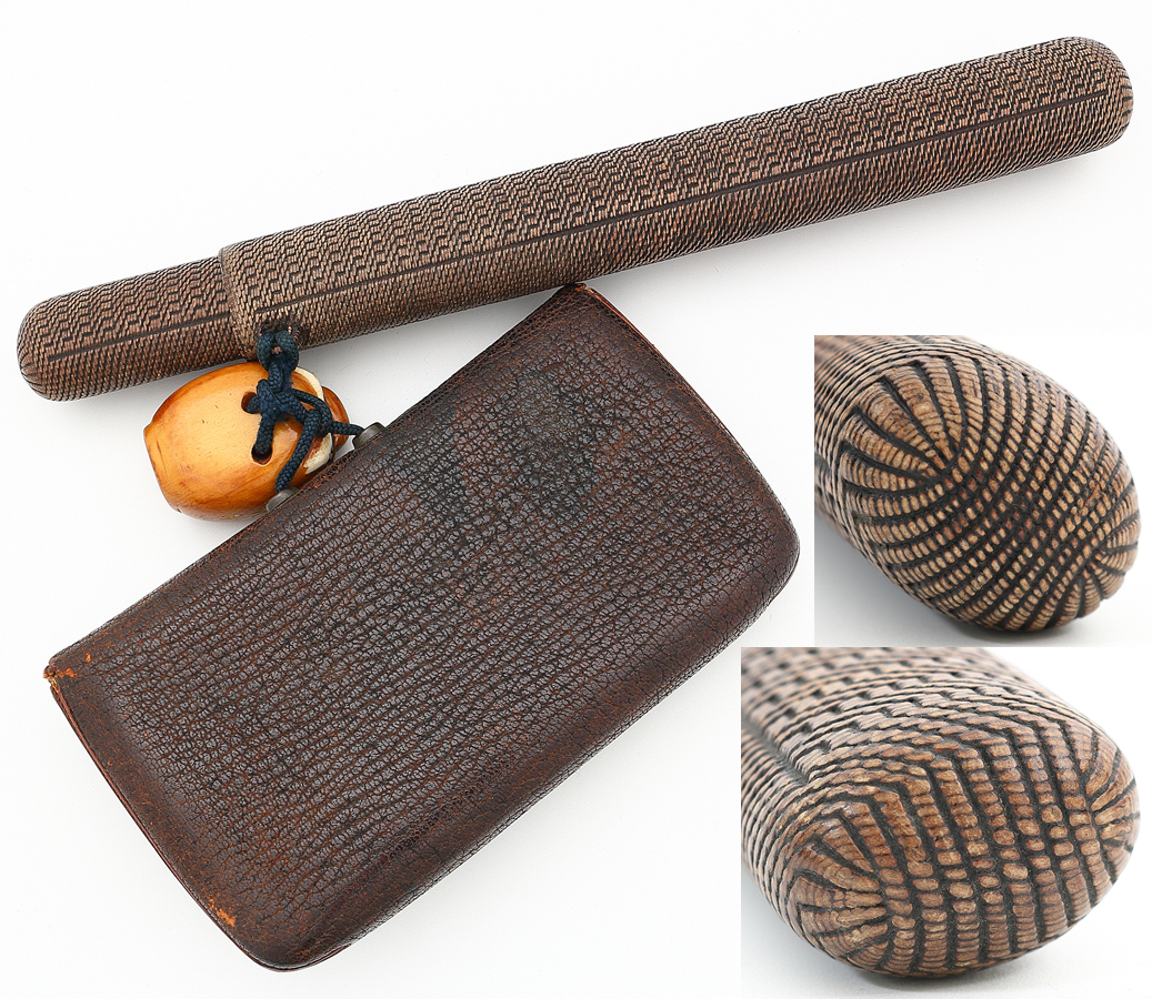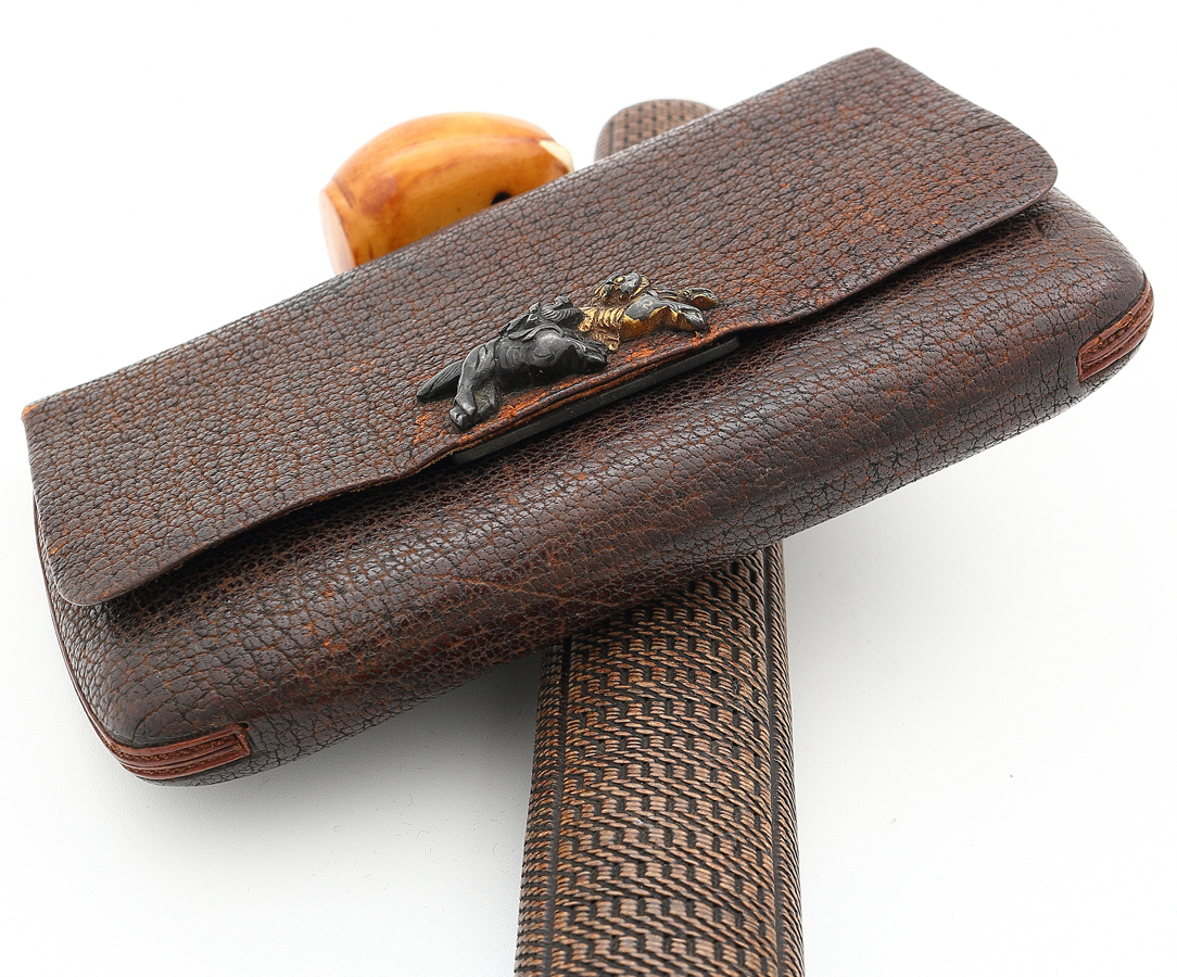 煙草入れ・・縦7.2×横12.5cm 革の擦れ・一か所極小の虫穴あり 中に刻み煙草入り 側面のステッチがお洒落 煙管筒・・・全長21.7cm 口が多少擦れています 木彫にも編み物にも思えます 根付・・・・縦3.7×横2.9cm 厚さ1.8cm 側面に細い筋あり 水月の銘 金具・・・・厚みがあり非常に良い作り | |