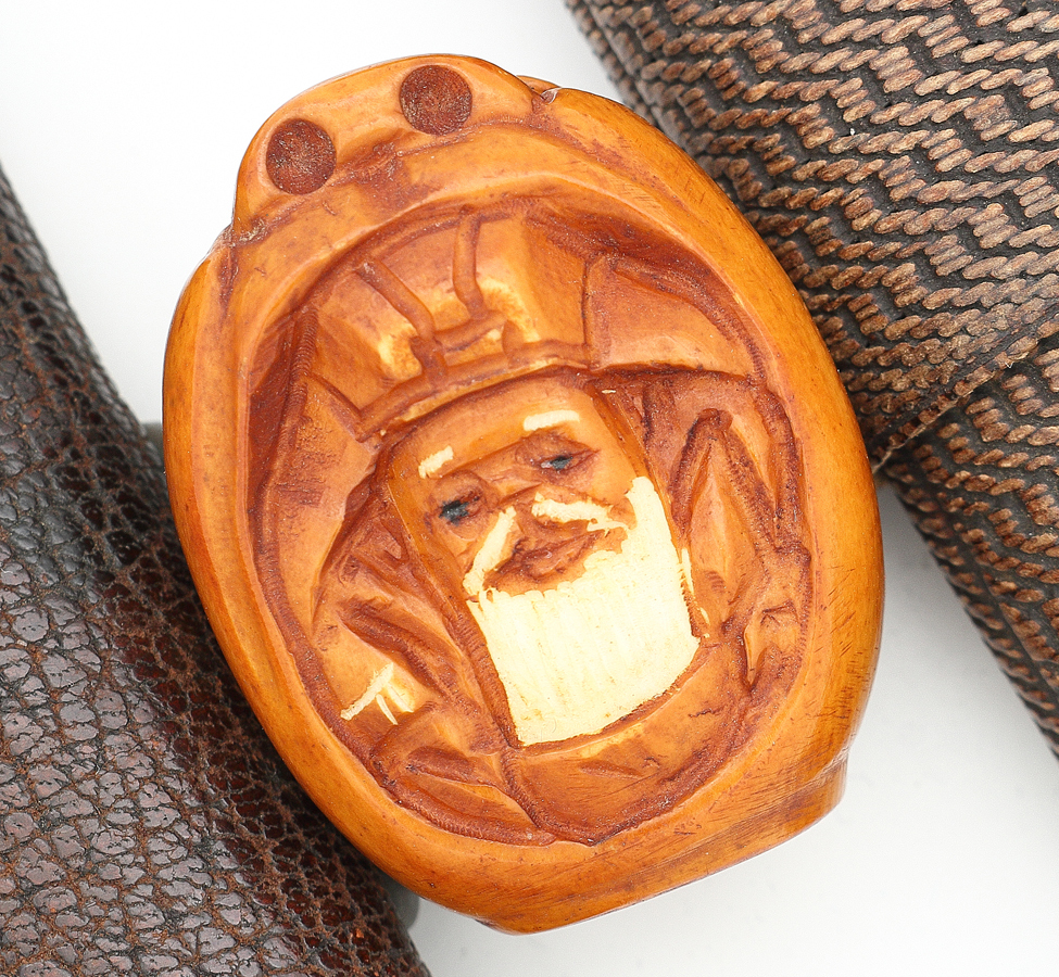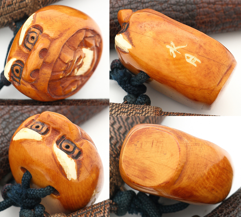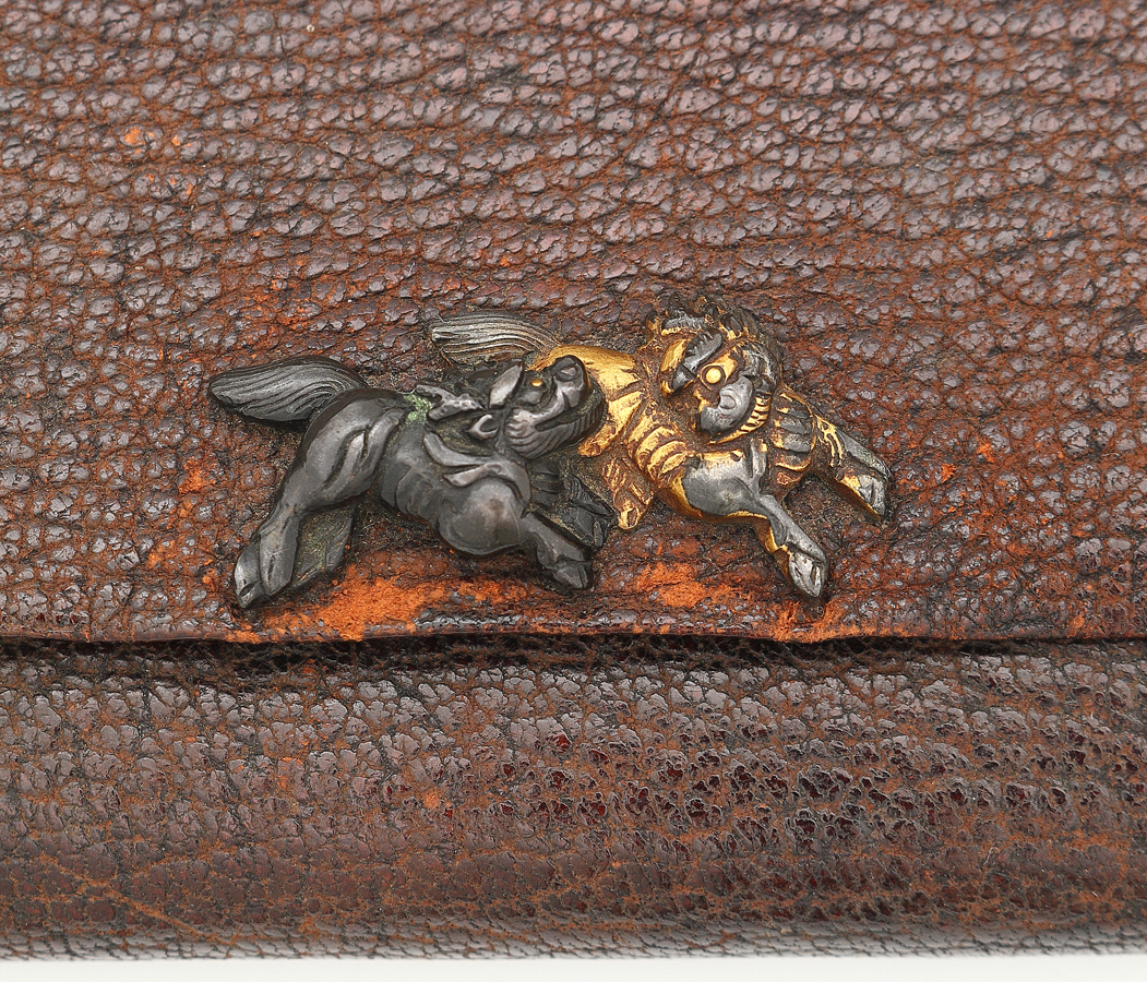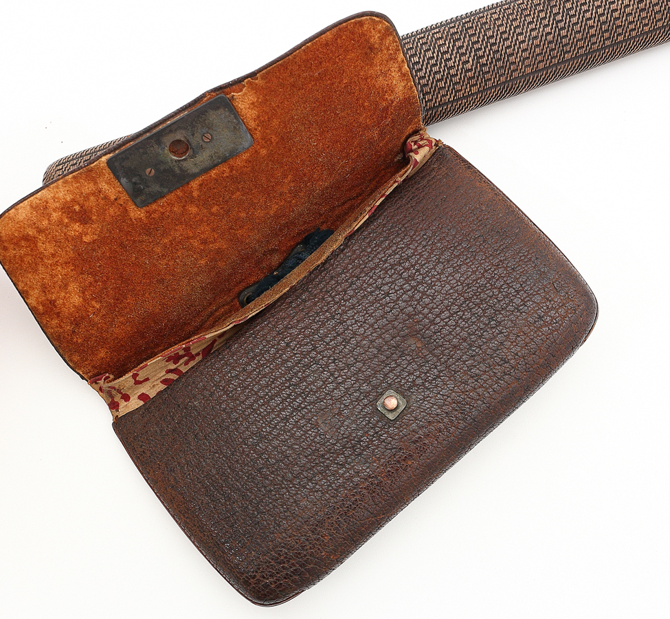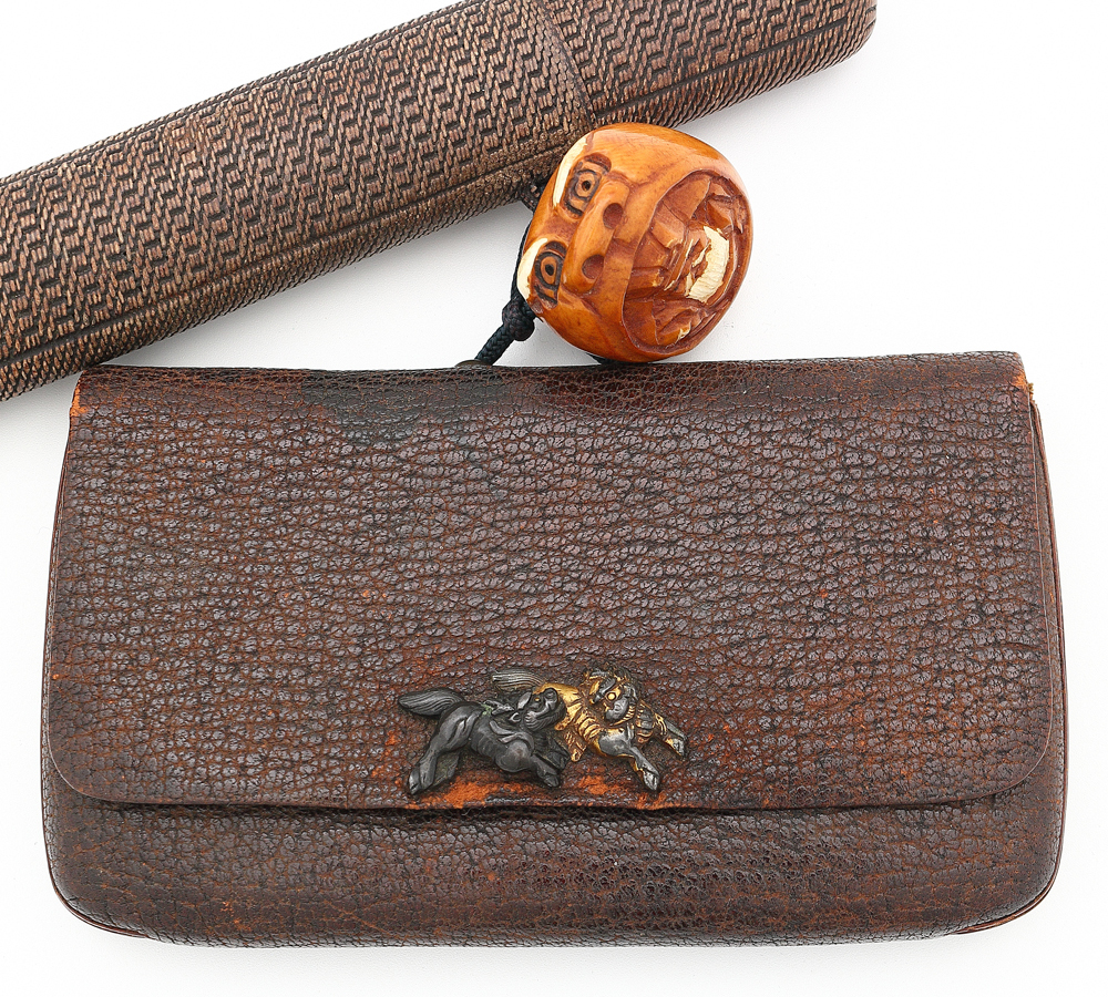 煙草入れ・・縦7.2×横12.5cm 革の擦れ・一か所極小の虫穴あり 中に刻み煙草入り 側面のステッチがお洒落 煙管筒・・・全長21.7cm 口が多少擦れています 木彫にも編み物にも思えます 根付・・・・縦3.7×横2.9cm 厚さ1.8cm 側面に細い筋あり 水月の銘 金具・・・・厚みがあり非常に良い作り | |