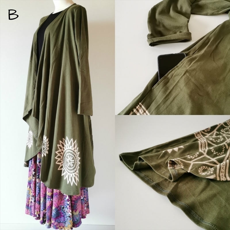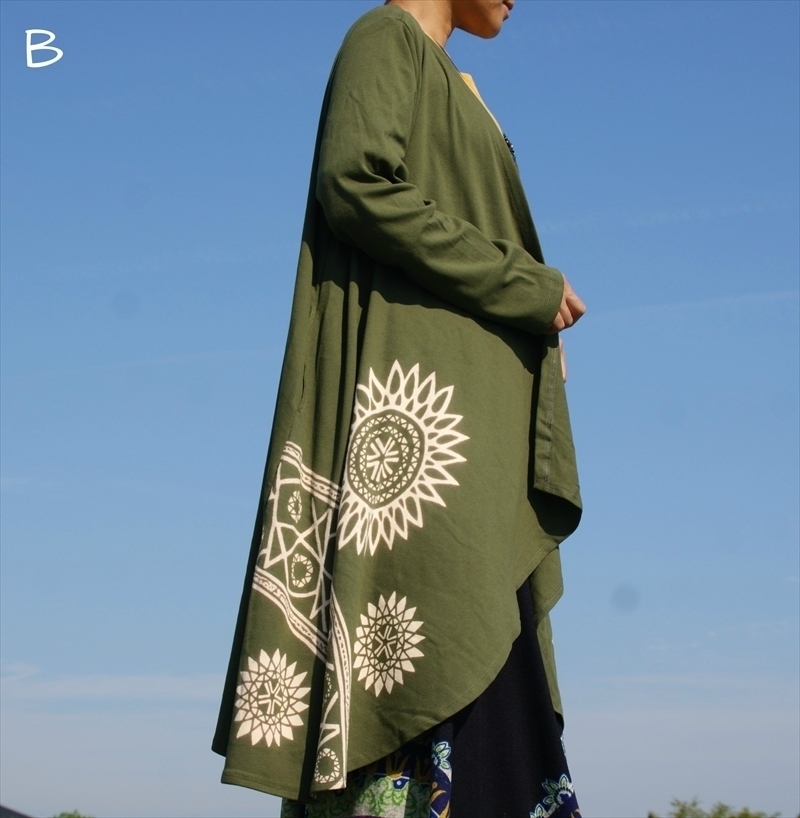 ゆ~ったり&美シルエット♪大人エスニックデザインとおしゃれなアシメシルエットがすてきなロングカーデ♪小柄さんからすらっとさん、ユニセックスでも楽しめるフリーサイズアイテムです。サルエルパンツなどのエスニックコーデや、シンプルItemのアクセントにしてもgood!!丸くカットされたアシメな裾が、羽織るだけでひらりと綺麗なシルエットを作ってくれます。ストレッチの効いた厚手のコットン素材なので、春先までロングシーズンお楽しみ頂けます◎両サイドにはポケットも付いて、あるととっても便利なおすすカーデ。