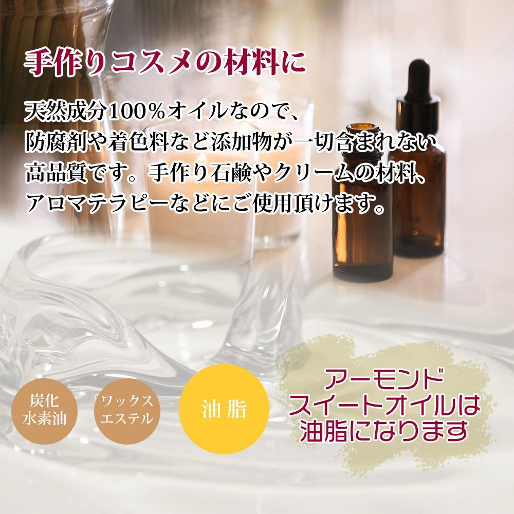 ピュアオイルの中ではホホバオイルも人気ですが、アーモンドスイートオイルの方が伸びが良く、滑らかです。
