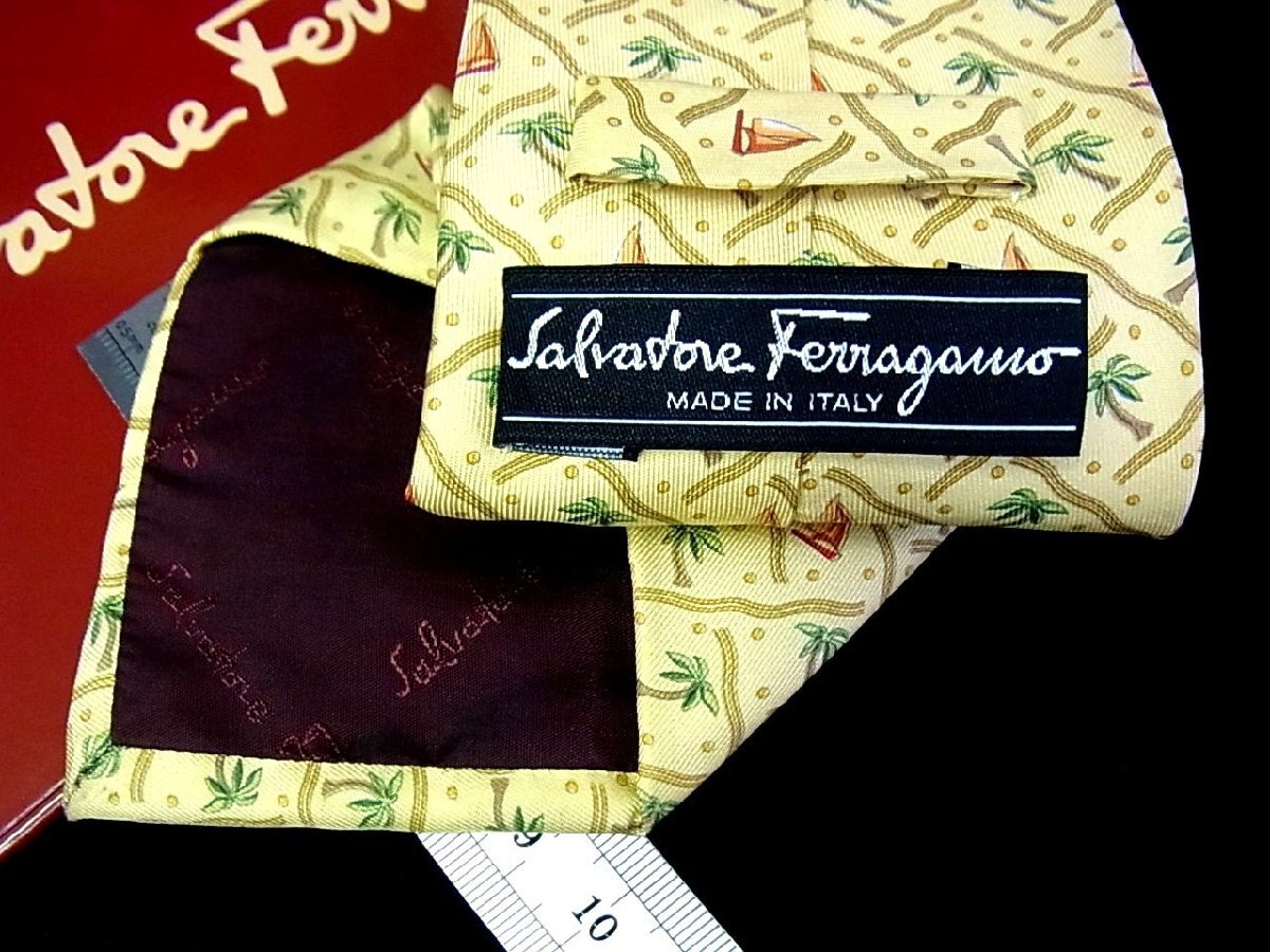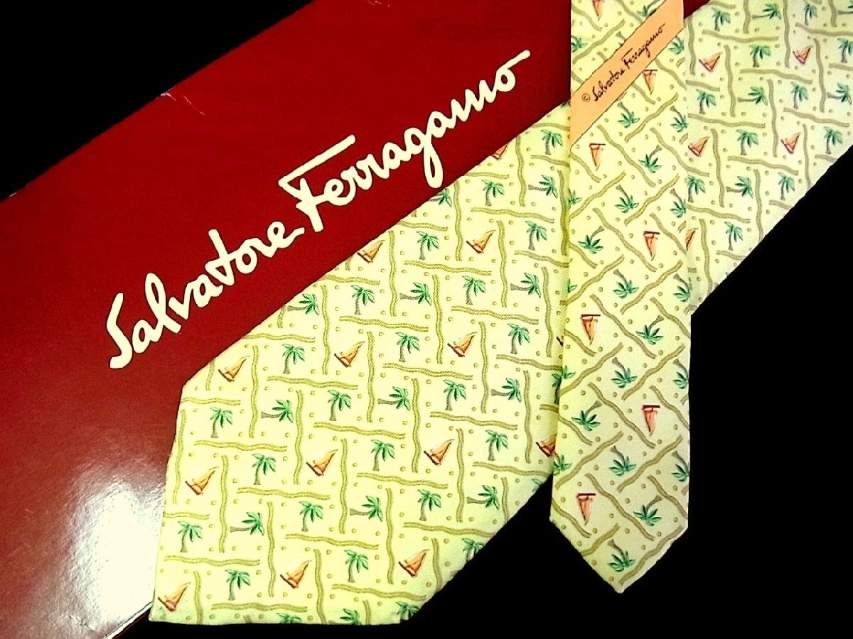 ★今週の特売★6789★高級ブランド【キャラ柄】★フェラガモ【船 ヨット 乗り物 ヤシの木 柄】ネクタイ★