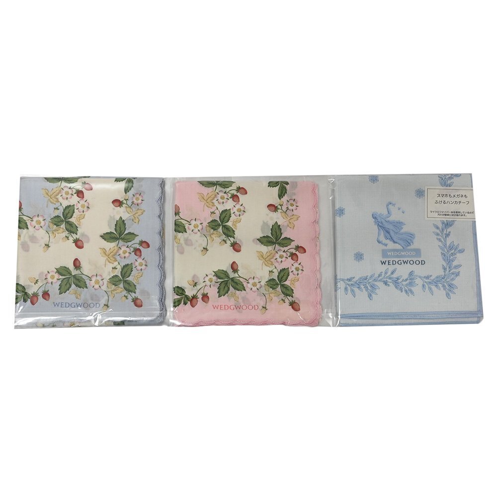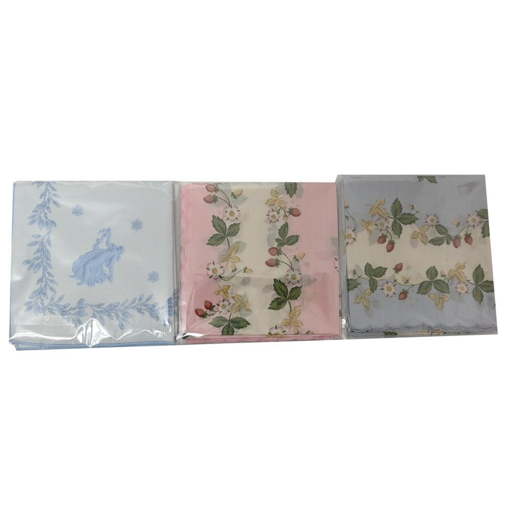 大きさ | 未開封の為、大きさの詳細が分かりかねます 四つ折りにした際の1辺の大きさは イチゴ柄のハンカチは約12.5cm程です。 天使柄のハンカチは約13cm程です。 |