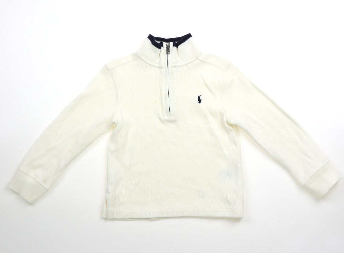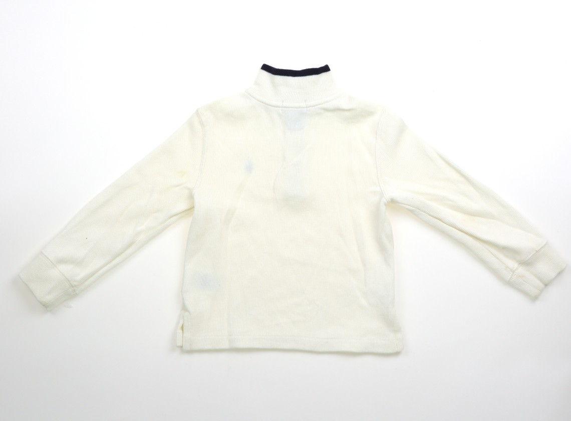 実際のサイズ表記は3/3Tで、厚手のカットソー生地です。両方の袖や胸やお腹にシミが複数ありますが、普段使いにいかがでしょうか。