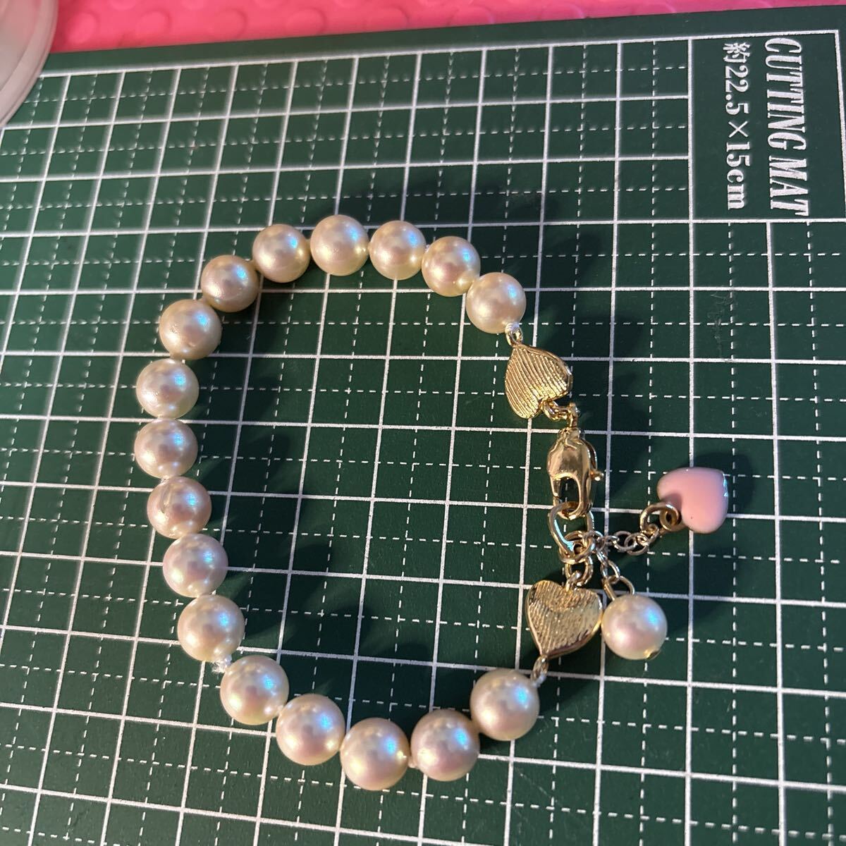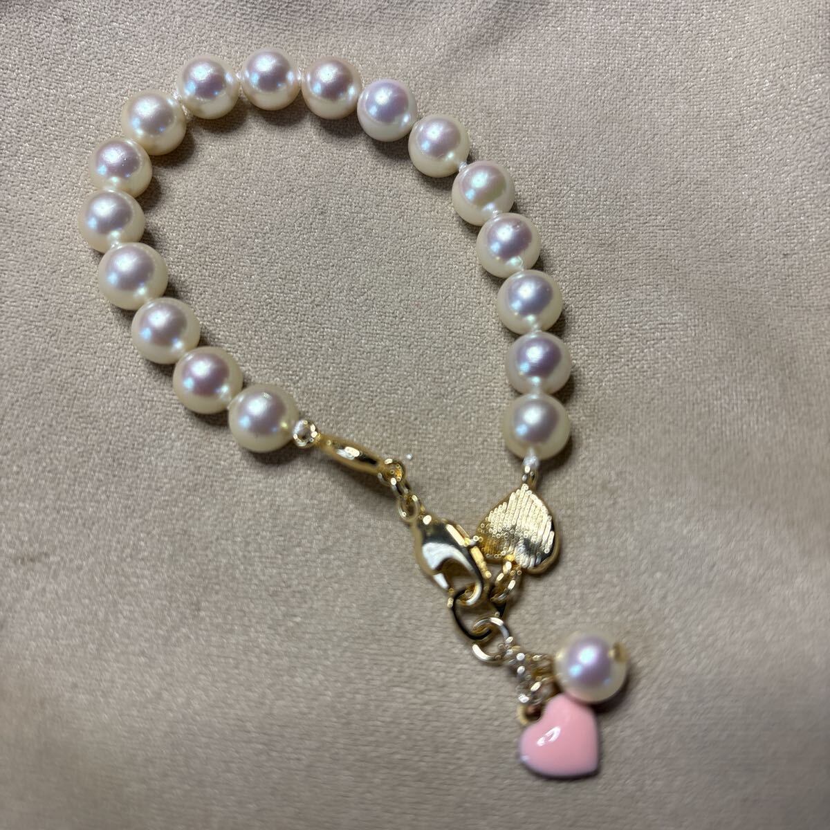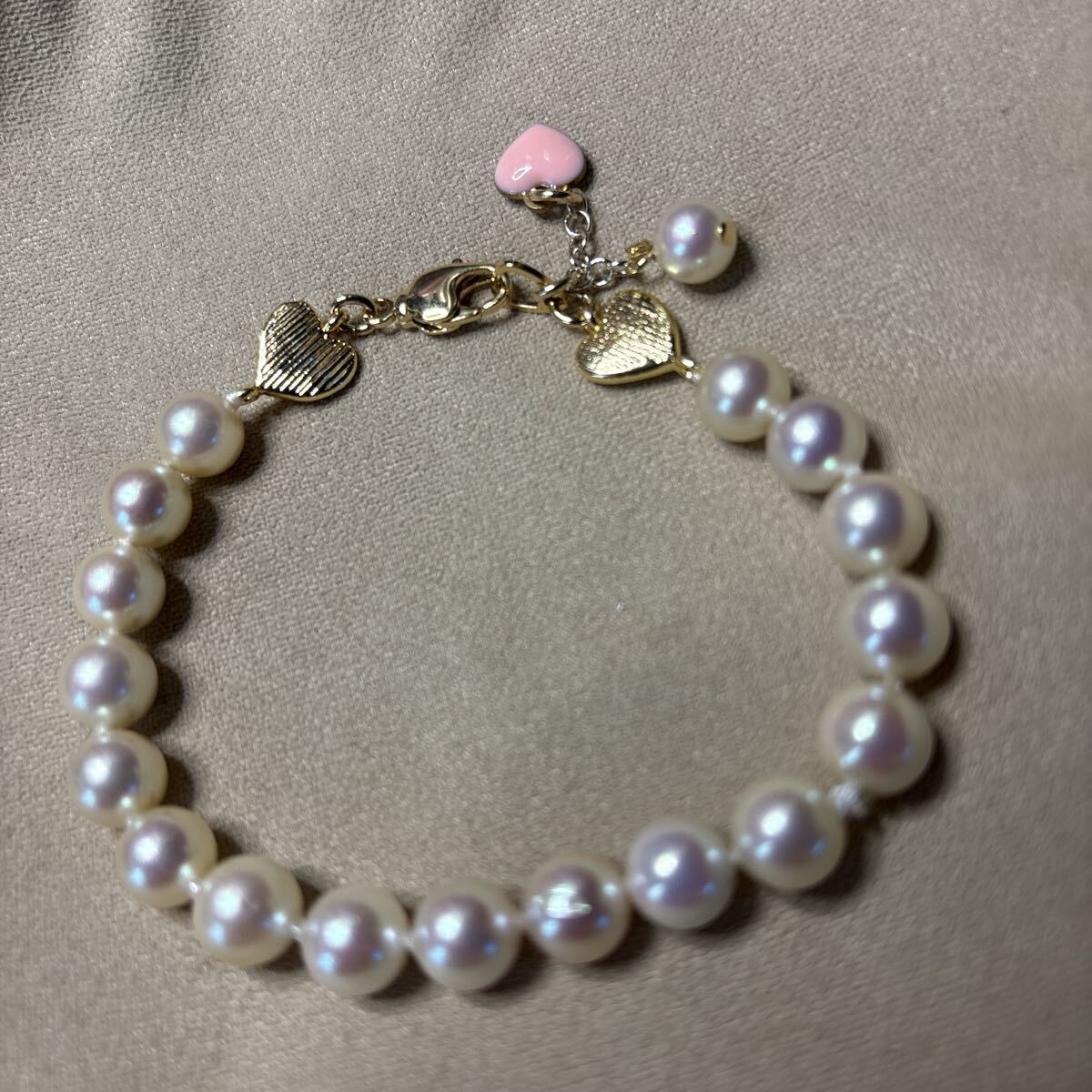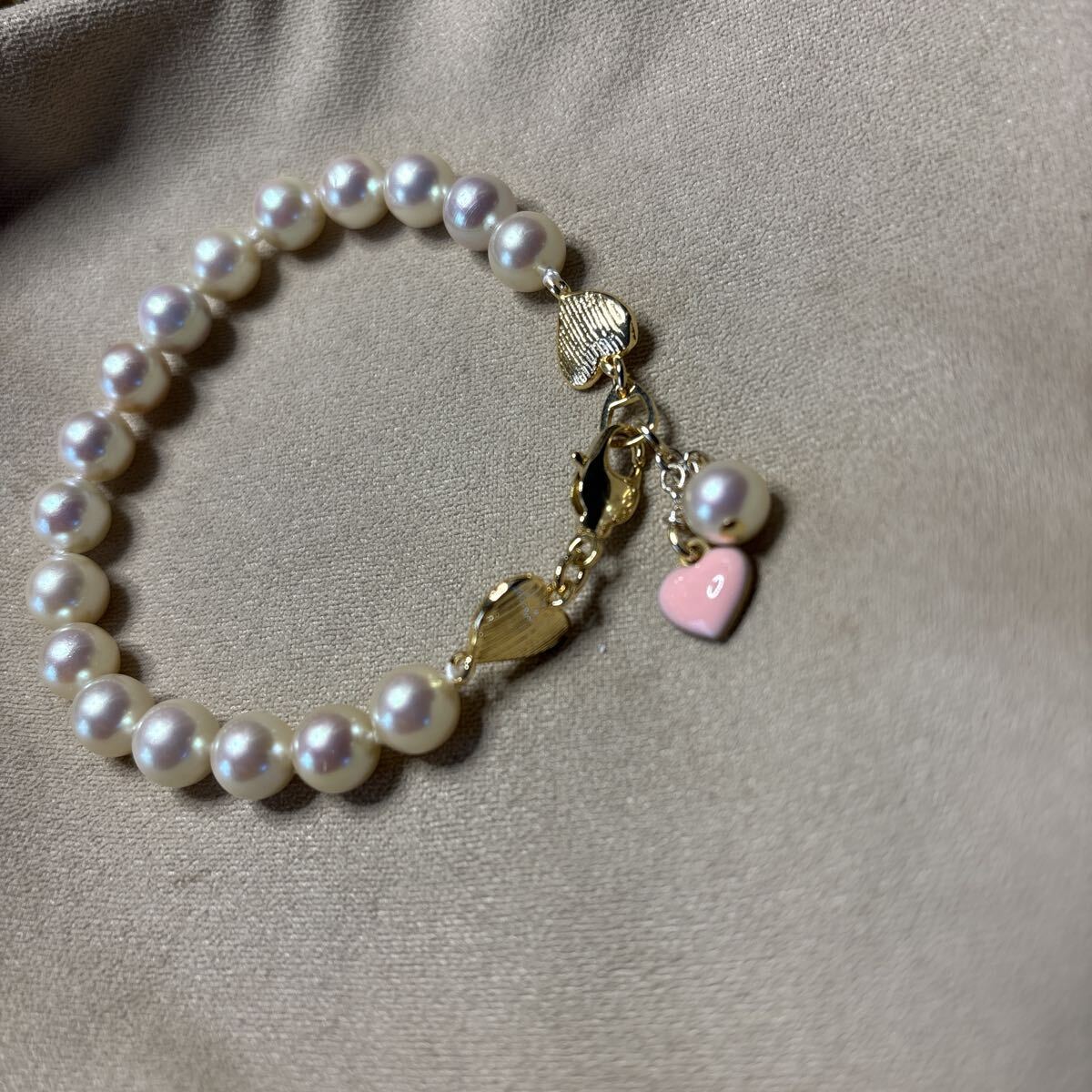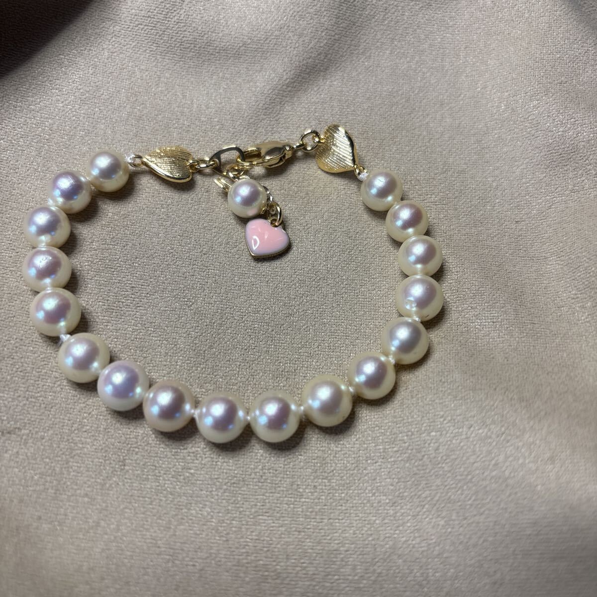 上質なピンク系貝パール使用しております。一粒一粒結び目を作り頑丈な糸で繋いであります。貝パール傷凹みあります。糸が見えたりする箇所もあります。